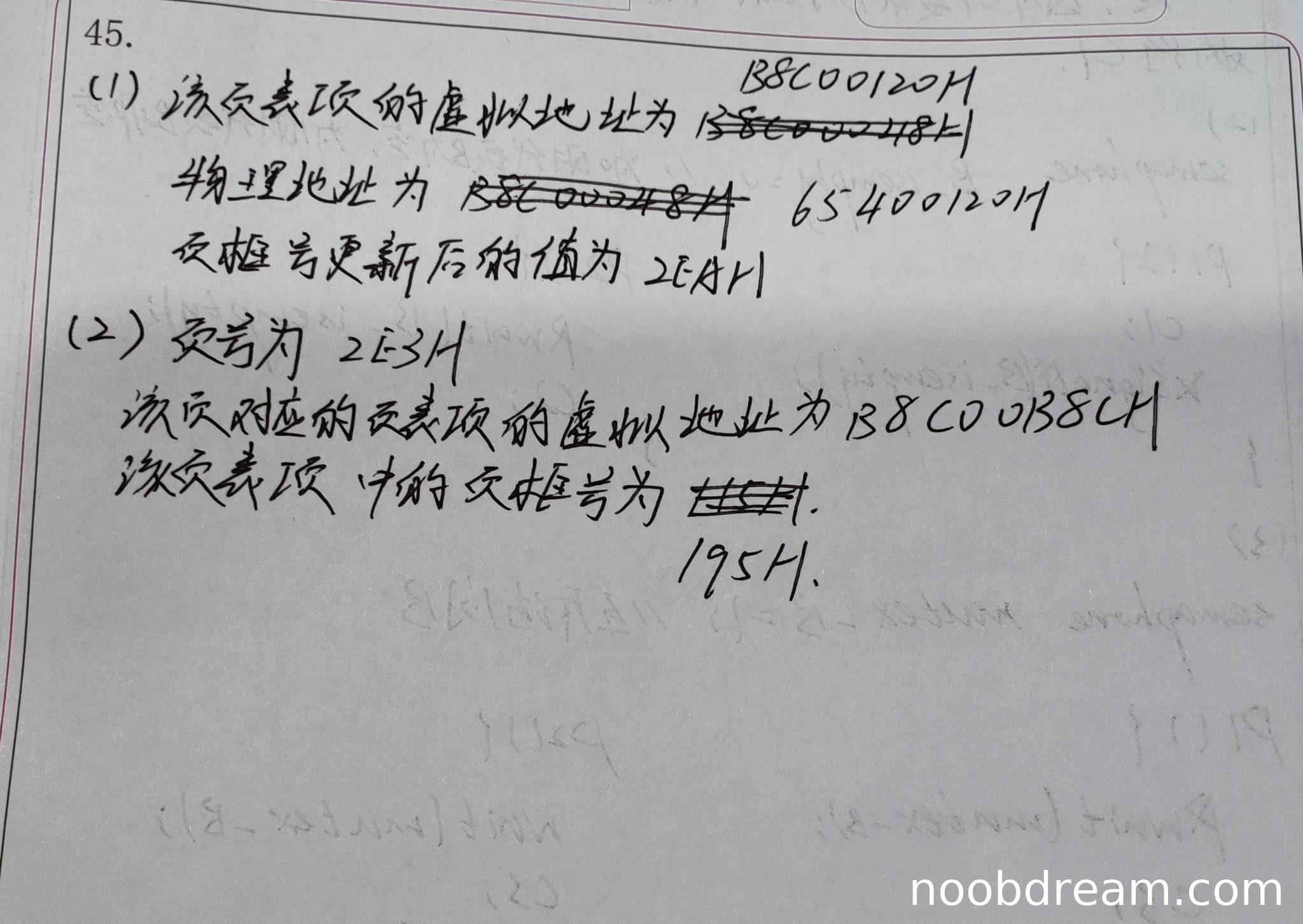 学生两次识别结果中页号2E3H正确,第二次识别结果中虚拟地址B8C00B8CH正确,页框号195H正确。虽然第一次识别结果中虚拟地址B8C00138CH有误(多了一位),但根据禁止扣分规则第3条,只要有一次识别正确就不扣分,因此该部分得满分4分。
