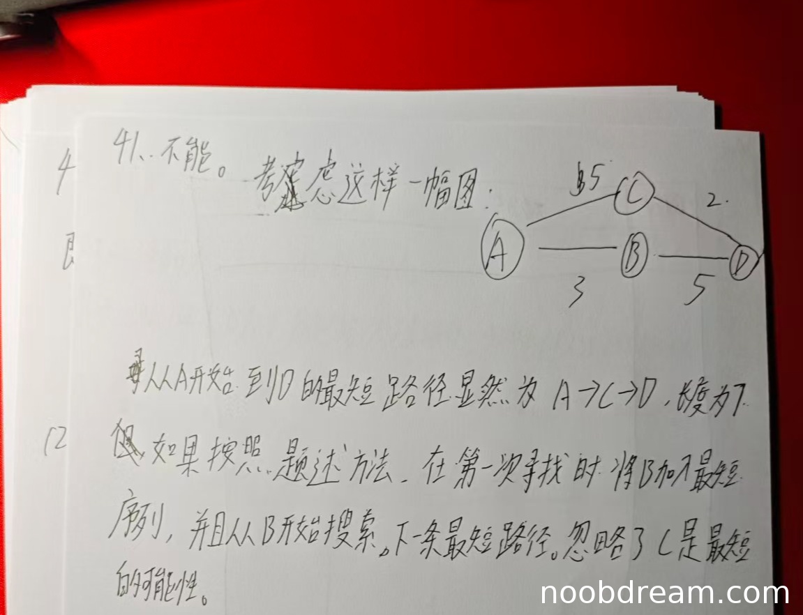 - 学生举例说明:从A到D的最短路径为A→C→D(长度为7),但按照题述方法会先选择B,导致错误路径,这与标准答案的逻辑一致(标准答案使用A到C的路径示例,但学生示例的核心逻辑相同,都是贪心局部最优导致全局错误)。
