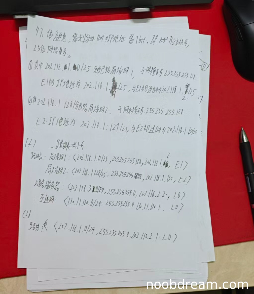 学生正确划分了子网为202.118.1.0/25和202.118.1.128/25,并正确给出了子网掩码255.255.255.128。尽管在第一次识别中主机号和网络号位数的描述有些混乱(如"7bit主机号,4 25位网络号"),但第二次识别中明确说明了"1bit子网号,25位网络前缀",且划分结果正确。根据禁止扣分规则,识别中的文字混乱不扣分。因此得3分。