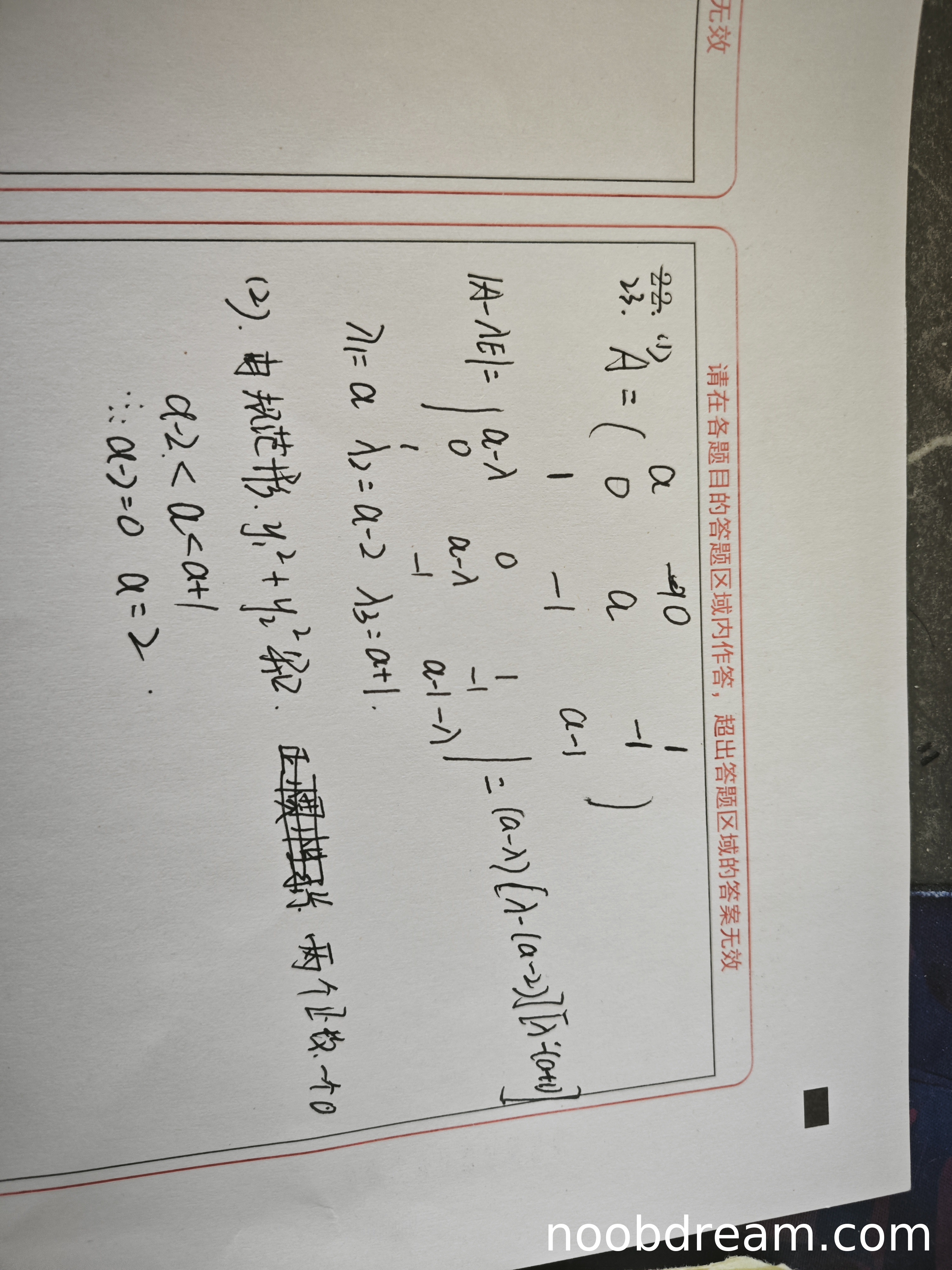 第一次识别中,学生正确得出 \( a-2=0 \Rightarrow a=2 \),但理由不完整(未讨论其他特征值为0的情况),且出现“\(y^2 + y^2 = 4\sqrt{2}\)”等无关内容,属于识别错误,不影响核心逻辑。第二次识别中,学生错误使用“\(\lambda_1^2+\lambda_2^2+\lambda_3^2=42\)”等无关条件,但最终通过“\(\alpha(\alpha-2)=0\)”并结合大小关系得出 \( a=2 \),部分逻辑正确。综合两次识别,核心结论正确,但推理过程不严谨,扣1分。得5分。