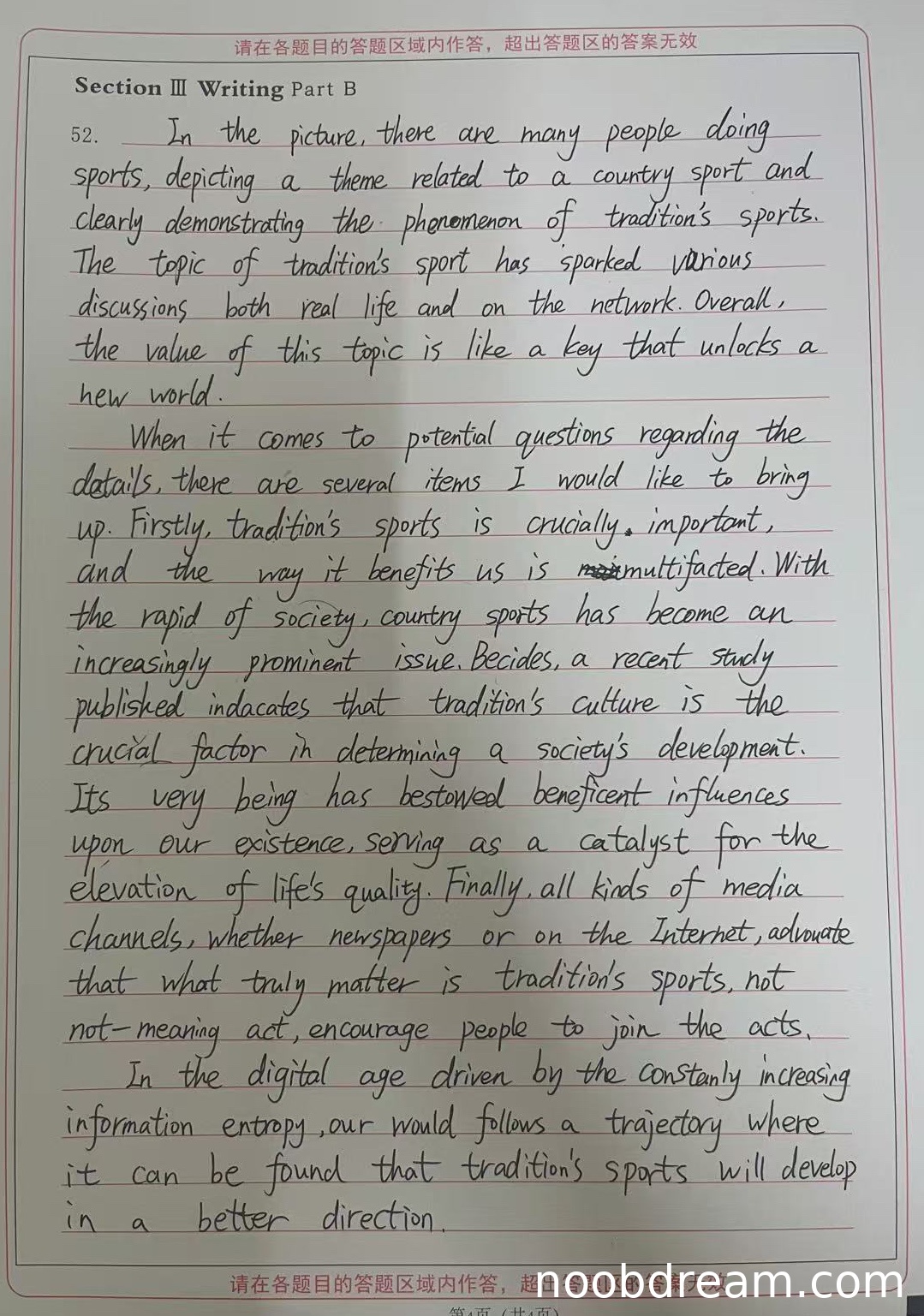 总体评价:该作文属于第二档(较差)。内容不完整,遗漏了图片描述的关键要点;对隐含意义的解读偏离主题;语言表达存在较多问题,包括语法错误(如"tradition's sports"的用法不当)、逻辑混乱和词汇使用不当。虽然字数符合要求,但未能有效完成题目要求的三个核心任务。