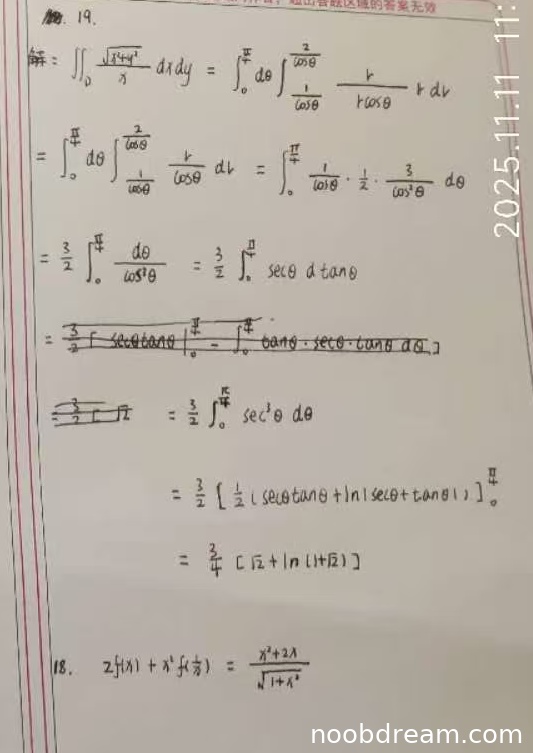 学生将积分化为∫₀^{π/4}dθ∫_{1/cosθ}^{2/cosθ}(r/(rcosθ))·rdr,这一步正确。但在计算r积分时出现了错误:应该是∫(r/cosθ)dr,但学生在计算中写成了∫(r/cosθ)dr,然后在代入上下限时出现了计算错误。标准答案得到的是(3/2)∫sec³θdθ,而学生得到的是(3/2)∫dθ/cos⁵θ,这是明显的计算错误。此处扣2分,得2分。