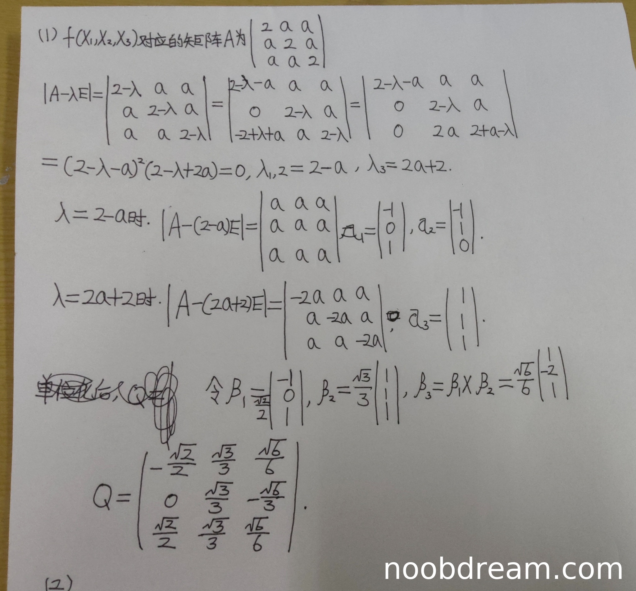学生作答中,特征值的计算有误。标准答案中特征值为 λ₁=2+2a, λ₂=λ₃=2-a,而学生计算得到 λ₁,₂=2-a, λ₃=2a+2,这与标准答案不一致且是错误的。特征向量部分,学生找到了 λ=2-a 的两个线性无关特征向量 (-1,0,1)ᵀ 和 (-1,1,0)ᵀ,以及 λ=2a+2 的特征向量 (1,1,1)ᵀ,这部分基本正确。但在正交化过程中,学生错误地使用了叉积来构造第三个向量,这不是标准正交化方法,且得到的向量与标准答案不同。单位化后的矩阵 Q 也不正确。由于特征值计算错误且正交变换构造有误,扣4分,得2分。