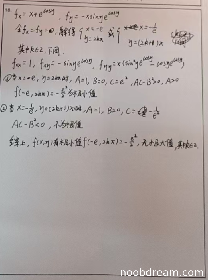 学生作答在两次识别中均正确求解了偏导数并找到所有驻点,正确计算了二阶偏导数和判别式,并准确判断了极值情况。虽然第一次识别中偏导数表达式有轻微书写错误(f_x = x + e^{cos y} 应为 e^{cos y} + x,但实质相同),但根据禁止扣分规则,这属于识别问题或误写,不扣分。整体逻辑完整且正确,与标准答案一致。