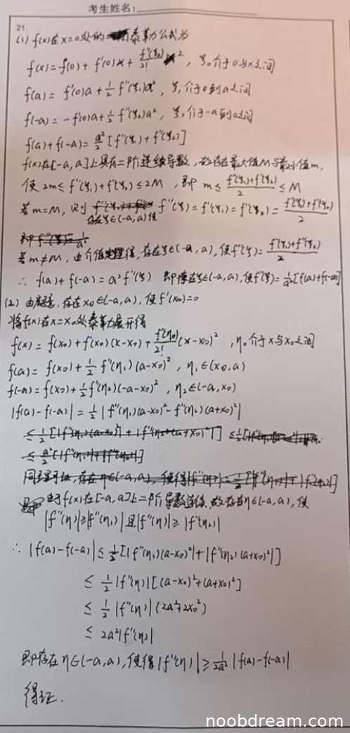 第1次识别:学生正确使用了泰勒公式展开,并得到f(a)+f(-a)的表达式。在应用介值定理时,虽然表述不够严谨(如"设其最大值值M与最小值m"应为"设其最大值M与最小值m"),但核心逻辑正确。最后结论正确。考虑到识别可能存在的误差,这些表述问题不扣分。得6分。
