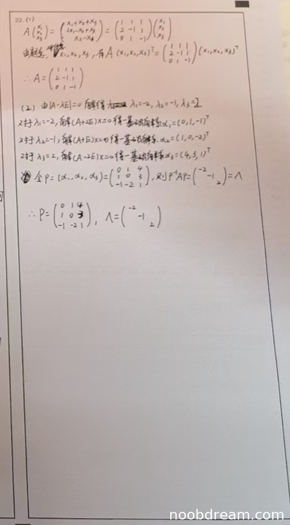 矩阵P和对角矩阵Λ:第1次识别中,P的列向量顺序为 \(\alpha_1, \alpha_2, \alpha_3\) 对应特征值 \(-2, -1, 2\),但Λ写为 \(\begin{pmatrix}-2&-1\\&2\end{pmatrix}\),形式不完整且未明确对角元素顺序,存在表达不严谨。第2次识别中,P的列向量顺序相同,但Λ明确写为 \(\begin{pmatrix}-2&0&0\\0&-1&0\\0&0&2\end{pmatrix}\),与P的列向量顺序匹配,且与标准答案的Λ仅在元素顺序上不同(标准答案为 \((-1,-2,2)\) 顺序),但特征值顺序不影响对角化本质,因此不扣分。综合两次识别,核心逻辑正确,得8分。