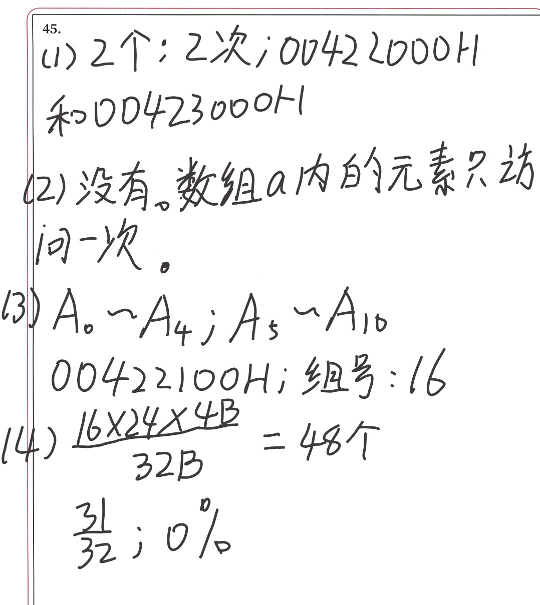 学生答案部分正确: - 块内地址A₀~A₄正确(1分) - Cache组号A₅~A₁₀正确(1分) - a[1][0]虚拟地址00422100H正确(1分) - 组号16错误,标准答案为8。计算过程:虚拟地址00422100H转换为二进制,块内地址A4~A0,组号A10~A5,00422100H对应的A10~A5应为001000(二进制)=8(十进制)。扣1分。 得3分。