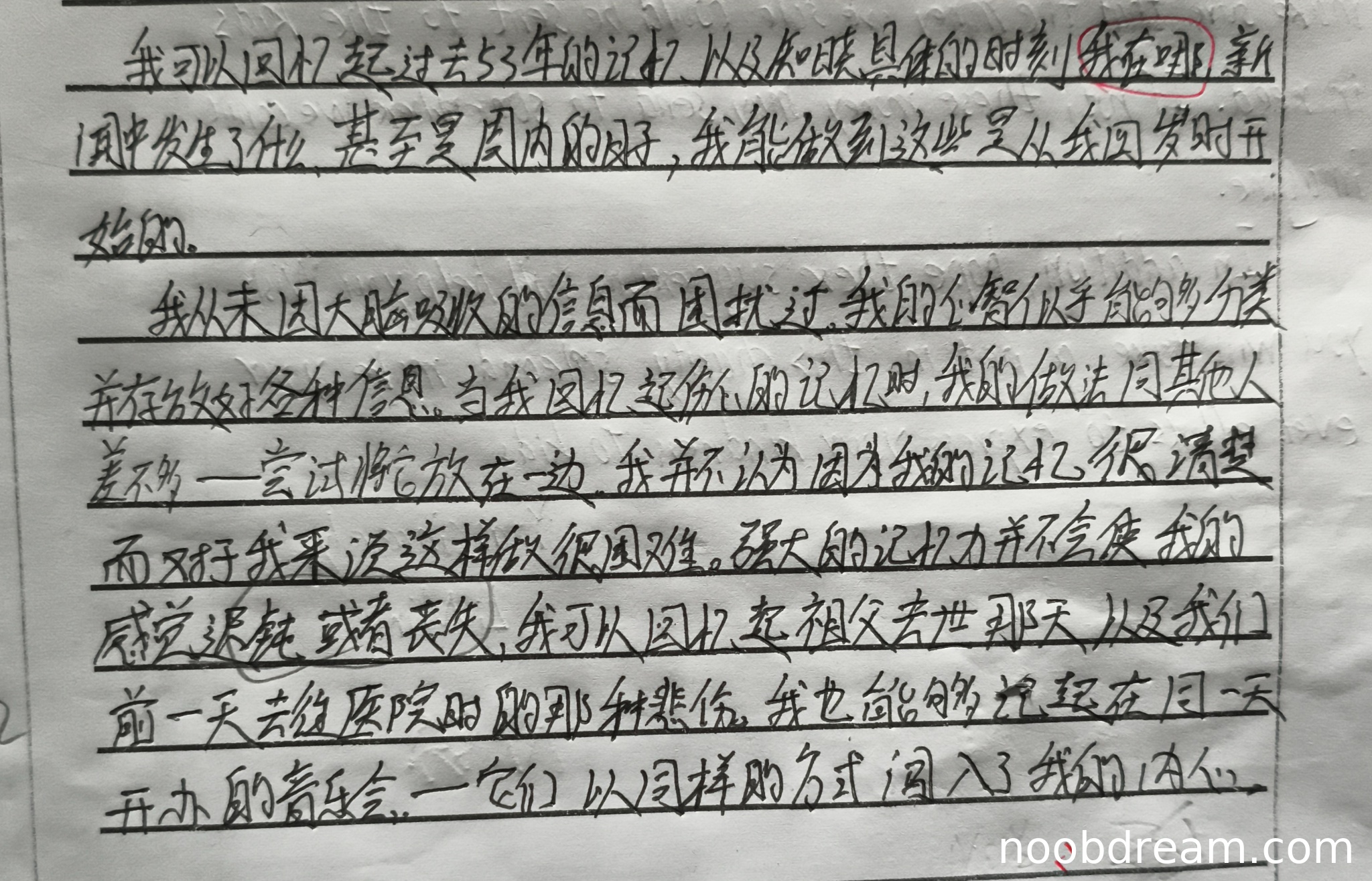 第二段翻译:"overwhelmed"译为"困扰"尚可接受;"stored away neatly"译为"分类并存放好"基本达意;"emotions any more acute or vivid"译为"感觉迟钝或者丧失"存在明显偏差;"musical play Hair opened on Broadway"译为"开办的音乐会"不够准确,漏译"百老汇"和剧名《发胶》。扣4分。
