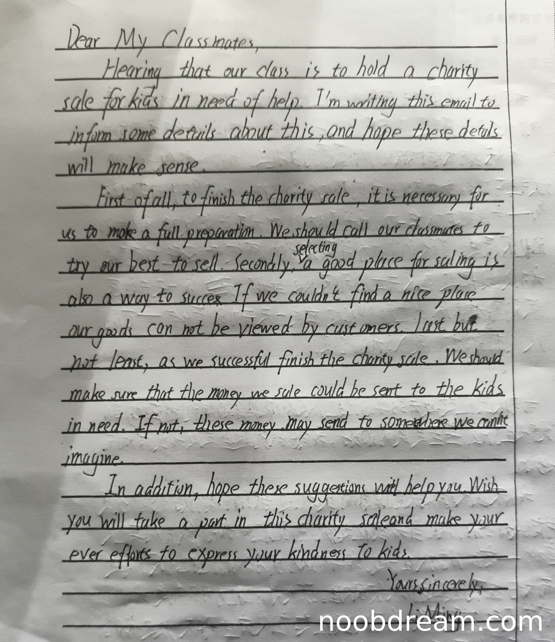 理由:邮件格式基本正确,有称呼和落款。但语域不够恰当,如"somewhere we can't imagine"等表达过于口语化,不符合正式邮件应有的语体风格。