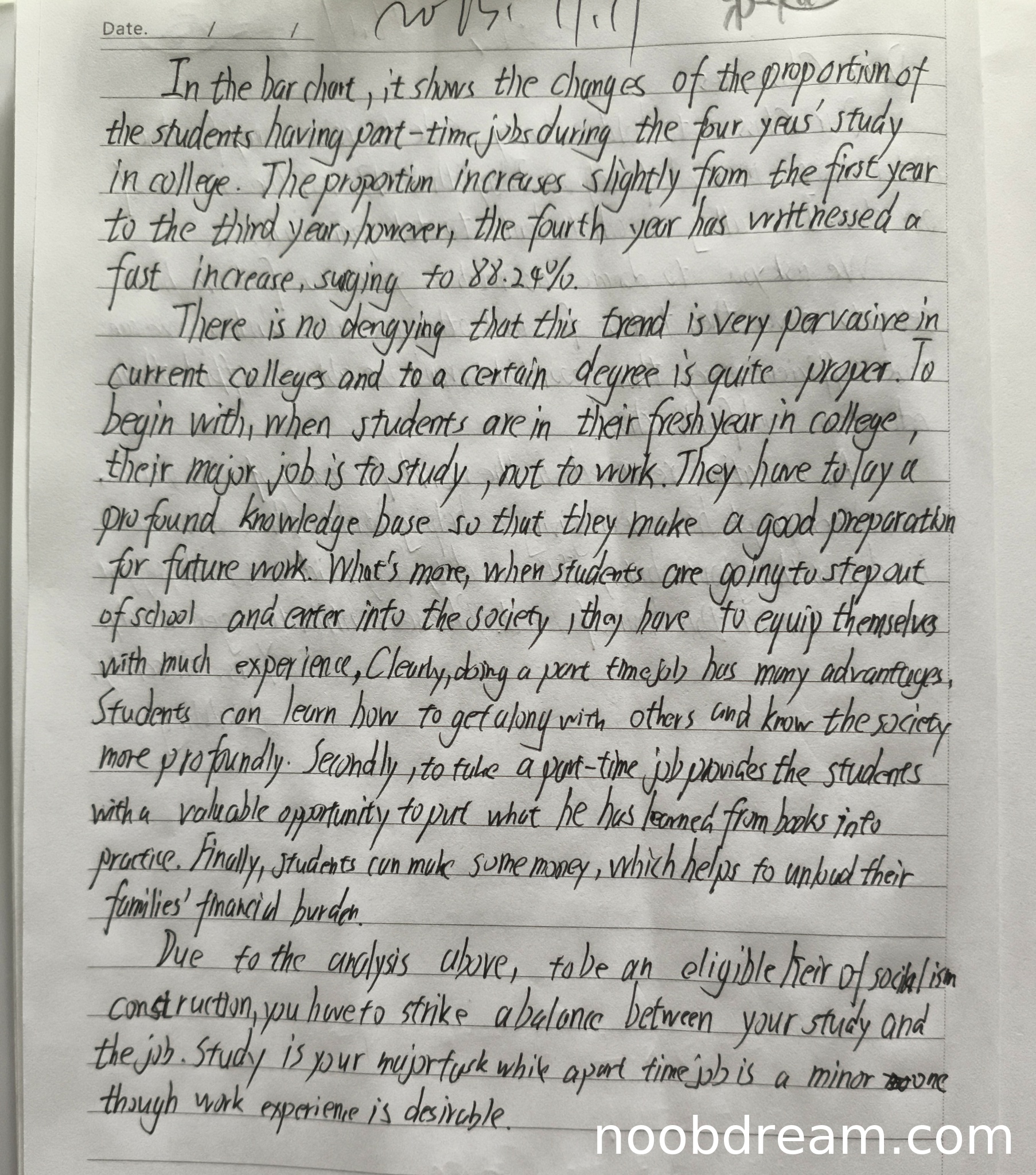 本题要求学生写一封关于慈善义卖的电子邮件,需要包含两个要点:告知活动细节和鼓励参与。但学生的作答内容完全偏离题目要求,写成了关于大学生兼职现象的议论文,与题目要求的电子邮件格式和内容无关。根据评分标准第一档(极差)标准:"内容与题目无关或严重跑题",应给予1-2分。考虑到作答仍有一定的语言组织能力,给予2分。