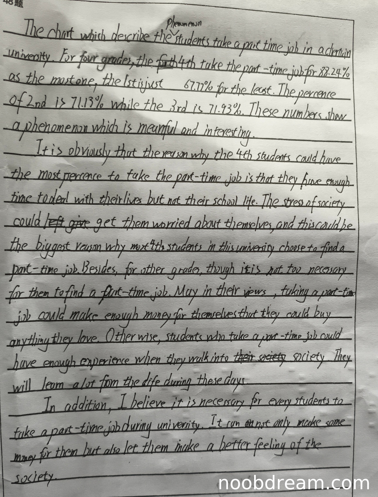 理由:评论部分提出了学生做兼职的原因(赚钱、积累社会经验)和个人观点(认为每个学生都应该做兼职),内容基本相关。但存在以下严重问题:1)逻辑混乱,如将"otherwise"用作递进关系;2)对大四学生比例高的原因分析存在明显逻辑错误;3)语言表达不够准确,如"make a better feeling of the society"表达不当。根据评分标准第四档(5-8分)"未能有效阐述一些内容要点",给予5分。