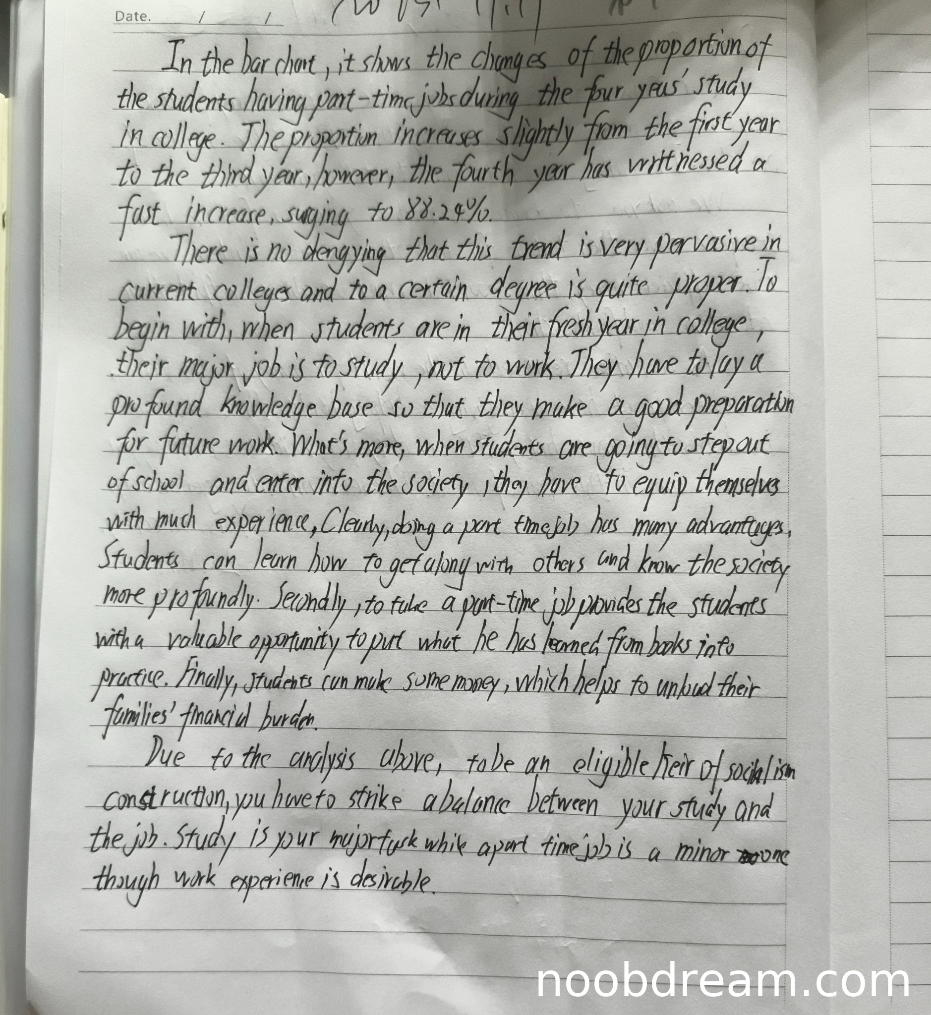 理由:学生基本完成了图表解读任务。第一段准确描述了整体趋势(前三年缓慢增长,第四年快速上升),并正确引用了具体数据(88.24%)。但存在两个问题:1)第一次识别结果中使用"sagging"(下降)与数据趋势相反,属于逻辑错误;2)未完整呈现所有年级的具体数据。根据评分标准第三档(7-9分)要求"包含多数内容要点",此处扣1.5分。