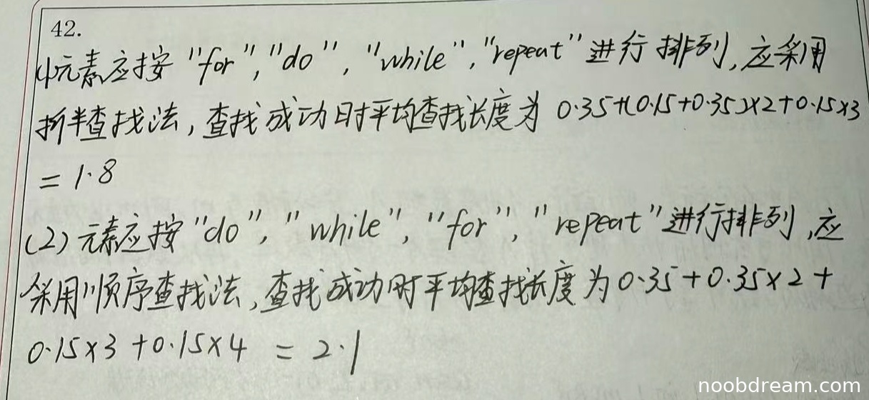 学生答案中排列顺序为"do","while","for","repeat",对应查找概率为0.35, 0.35, 0.15, 0.15,这是按概率降序排列。采用顺序查找法正确。计算的平均查找长度2.1正确。因此得满分5分。