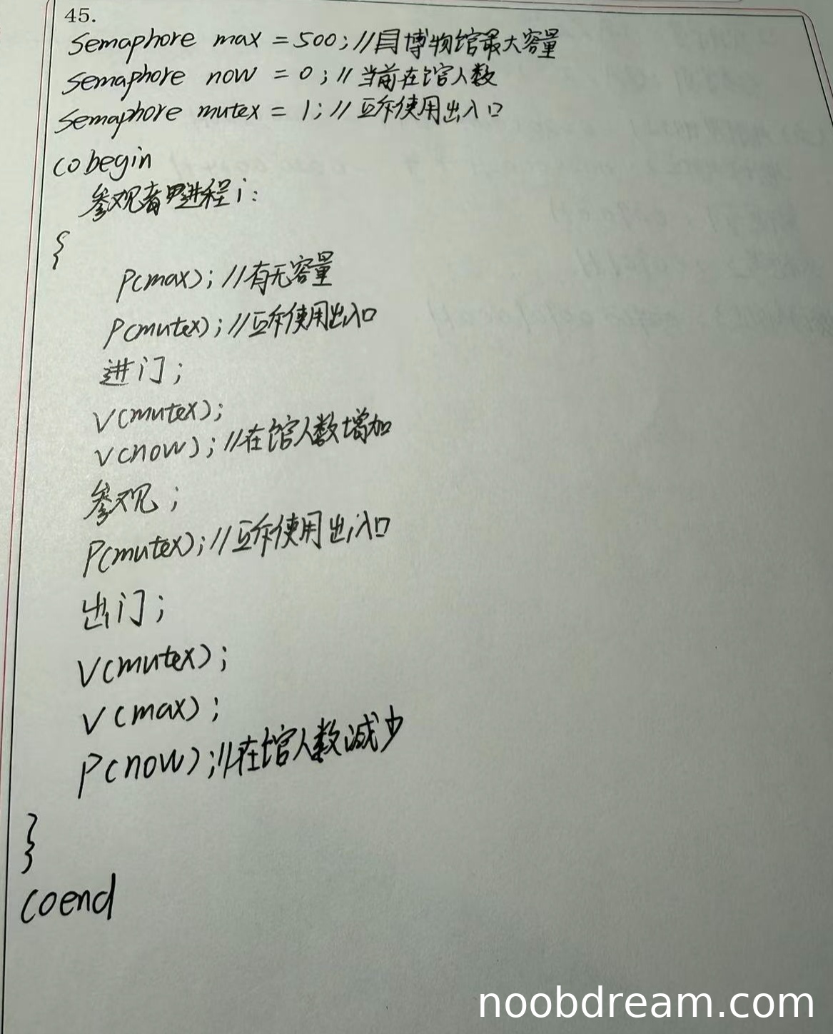 学生使用max信号量(对应标准答案中的empty)来控制博物馆容量,但操作顺序存在逻辑错误:在进门后增加了V(now)操作,在出门后增加了P(now)操作,这会导致now信号量的值可能为负,违反信号量使用规则。虽然max的P、V操作位置正确(进门前P(max),出门后V(max)),但多余的now操作引入了潜在错误。因此扣1分,得0分。