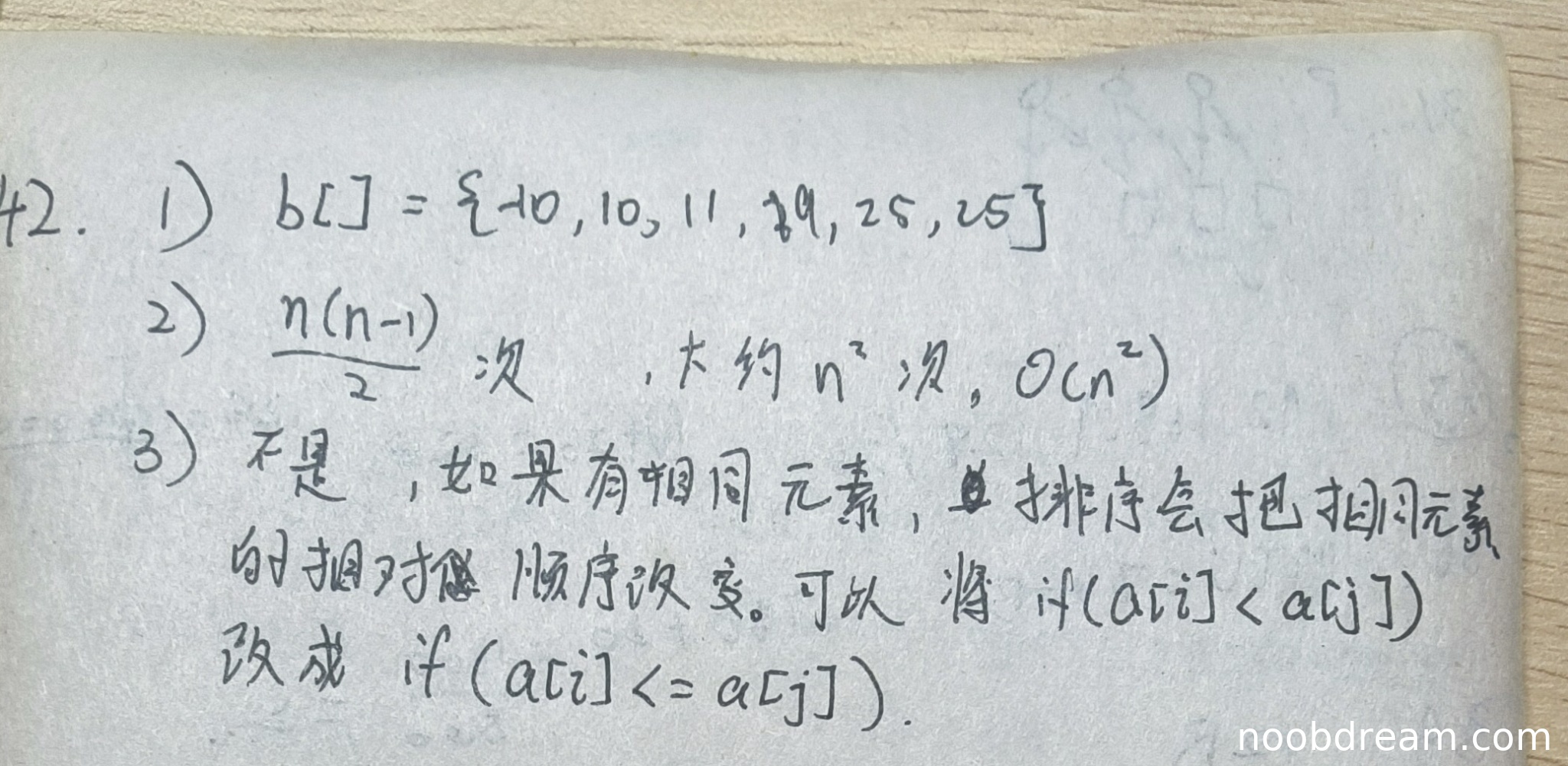 学生正确给出了比较次数为n(n-1)/2,并且补充了时间复杂度分析。虽然题目只要求比较次数,但额外分析不影响得分。得2分。