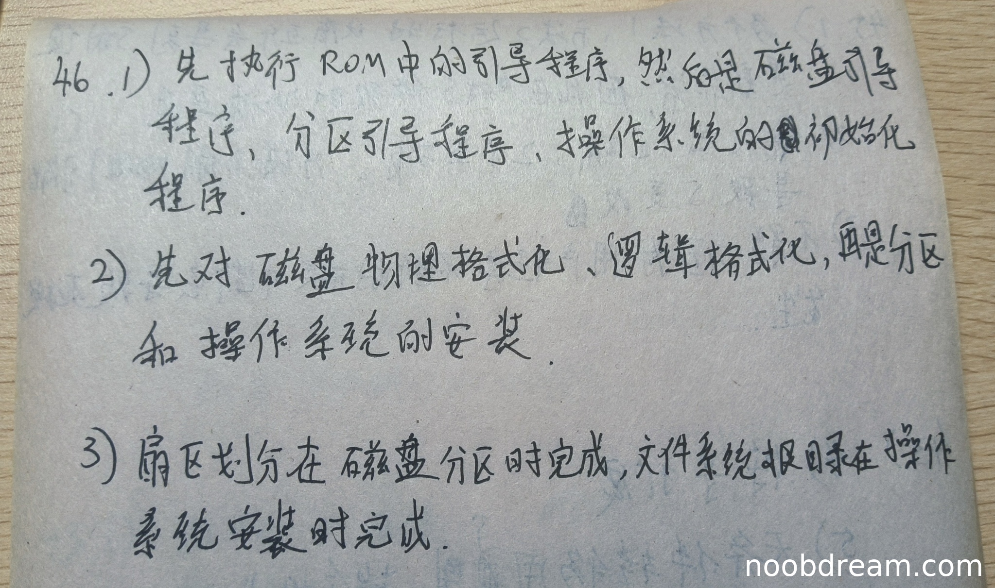 学生答案中扇区划分在磁盘分区时完成,但标准答案中扇区划分是在物理格式化时完成的;文件系统根目录在操作系统安装时完成,但标准答案中是在逻辑格式化时完成的。两个部分均存在逻辑错误,各扣1分,得0分。