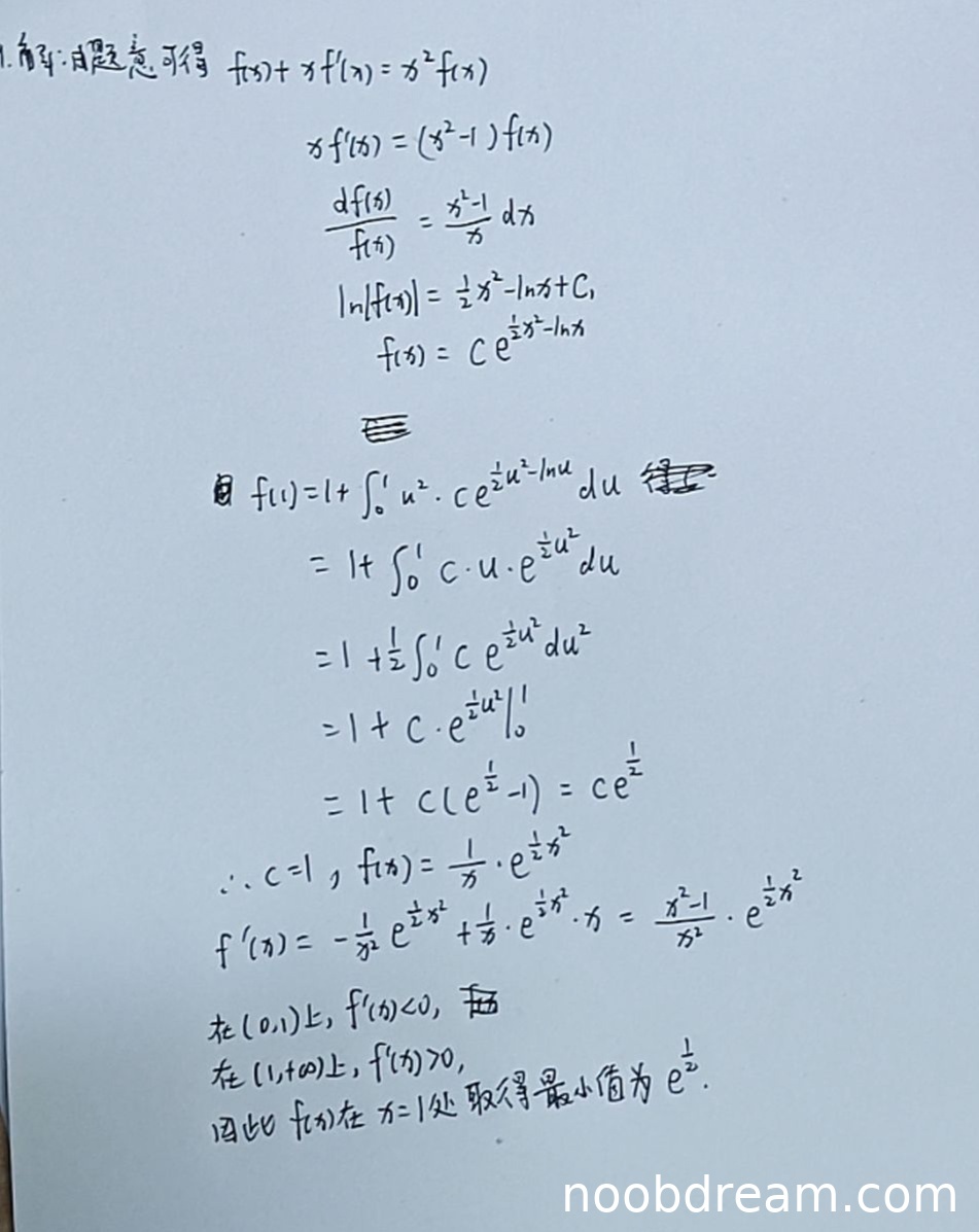 学生正确求出导数并分析单调性,确定x=1为极小值点,并正确计算最小值e^(1/2)。虽然导数表达式写为(x²-1)/x²·e^(x²/2)与标准答案形式不同但等价。此处逻辑完整正确,得4分。