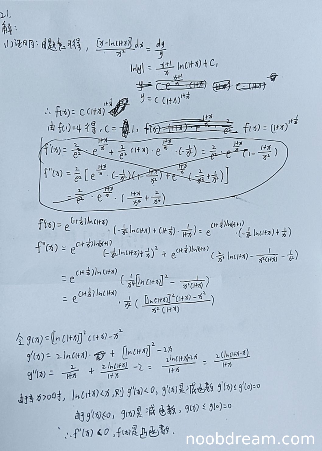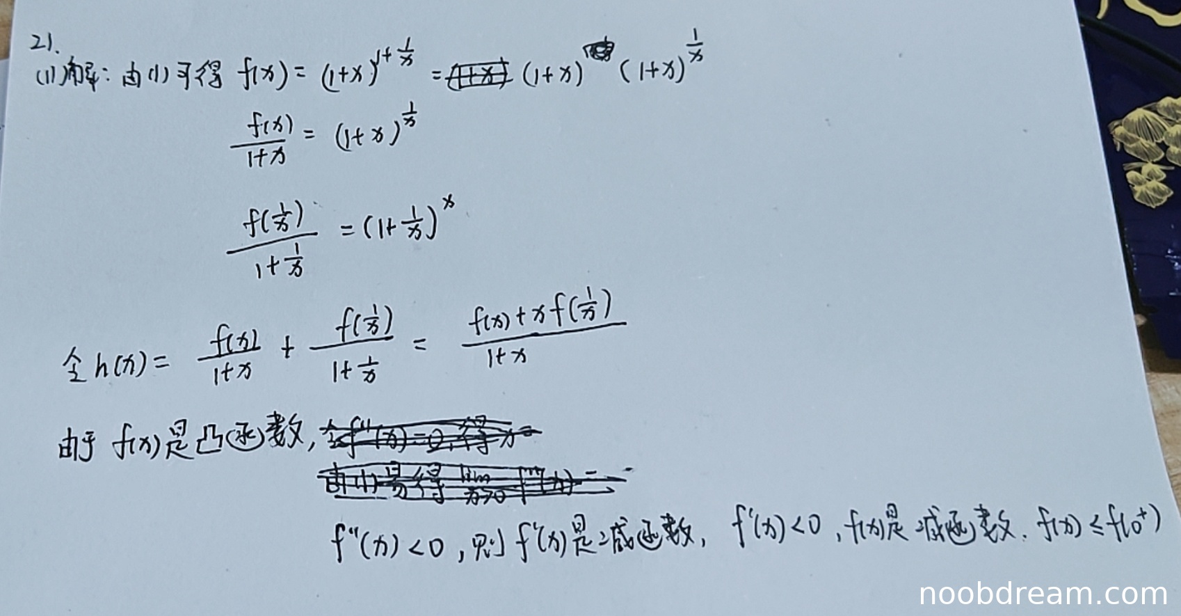 学生正确求解了函数表达式 \( f(x) = (1+x)^{1+\frac{1}{x}} \),并计算了一阶导数和二阶导数。通过分析 \( g(x) = (1+x)\ln^2(1+x) - x^2 \) 的二阶导数 \( g''(x) < 0 \) 得出 \( g(x) < 0 \),从而证明 \( f''(x) < 0 \),说明 \( f(x) \) 是凸函数。证明过程完整且逻辑正确。但存在一处错误:在求一阶导数时,方法一的结果 \( f'(x) = (1+x)^{1+\frac{1}{x}} \cdot \left(-\frac{1}{x^2}\ln(1+x) + \frac{1}{x}\right) \) 与标准答案形式不同,但经化简可验证等价(标准答案为 \( \frac{x-\ln(1+x)}{x^2} \),而学生结果为 \( \frac{1}{x} - \frac{\ln(1+x)}{x^2} = \frac{x-\ln(1+x)}{x^2} \)),因此不扣分。但在二阶导数推导中,学生直接给出 \( f''(x) = e^{(1+\frac{1}{x})\ln(1+x)} \cdot \frac{1}{x^4} \left( [\ln(1+x)]^2 (1+x) - x^2 \right) \),未展示完整推导步骤,但结论正确。考虑到核心证明逻辑无误,扣1分(步骤不完整)。得5分。
