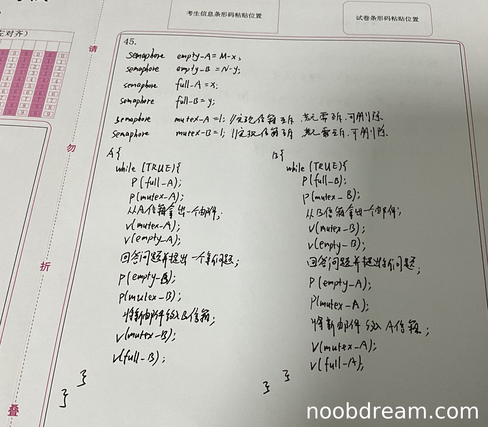 理由:B方的代码逻辑与A方对称且完全正确。P(full_B)和P(mutex_B)的顺序正确,取出邮件后释放互斥锁并增加空位,然后P(empty_A)和P(mutex_A)的顺序也正确,放入邮件后释放互斥锁并增加A信箱的邮件计数。所有同步和互斥操作的使用都符合要求。