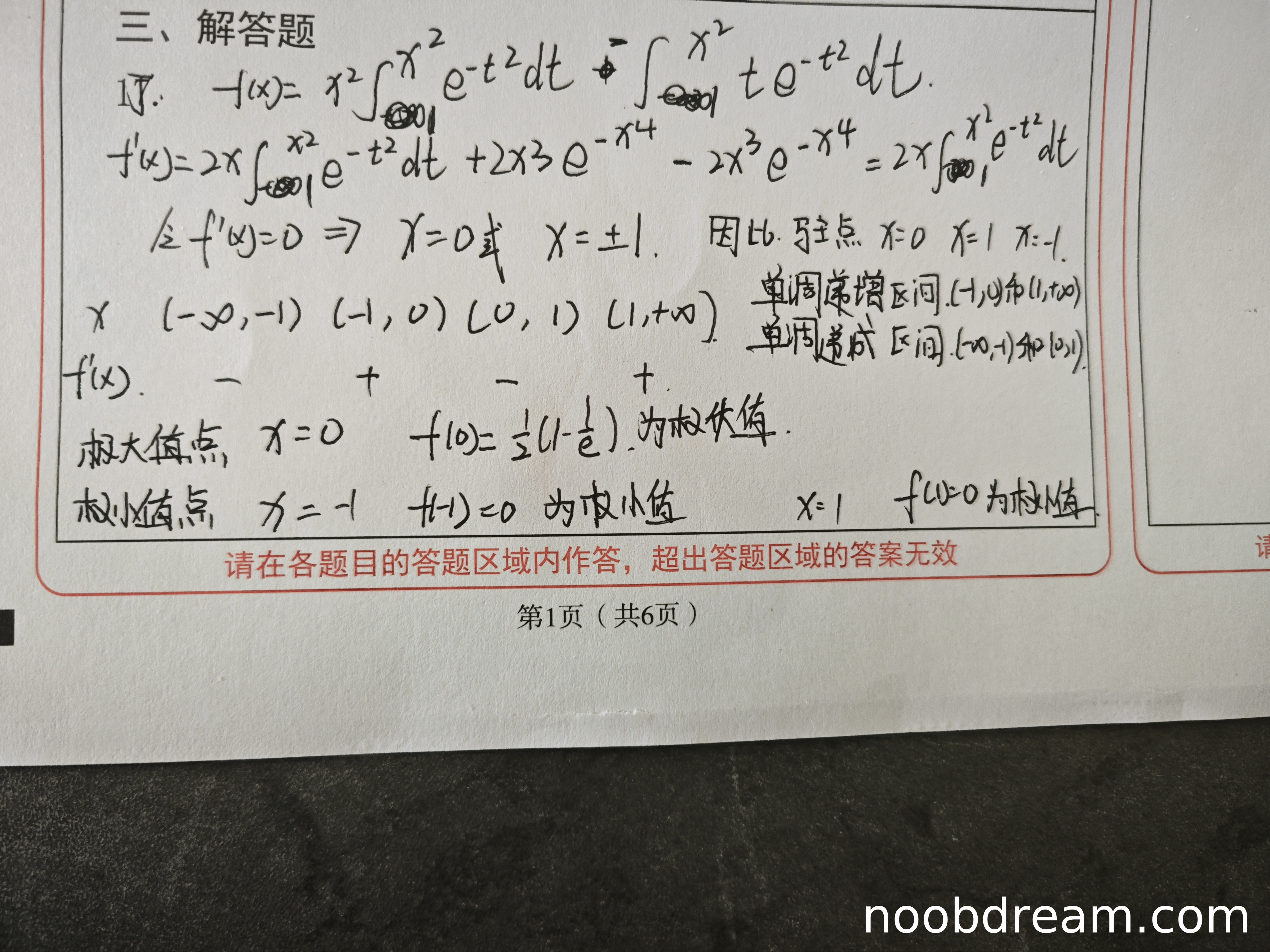 学生正确判断x=0为极大值点,x=±1为极小值点,但在计算f(0)时出现错误:f(0)=½(1-1/e)是错误的,实际上f(0)=0。根据标准答案,f(0)=∫₀⁰(0-t)e^{-t²}dt=0。这是一个计算错误,扣1分。得2分。