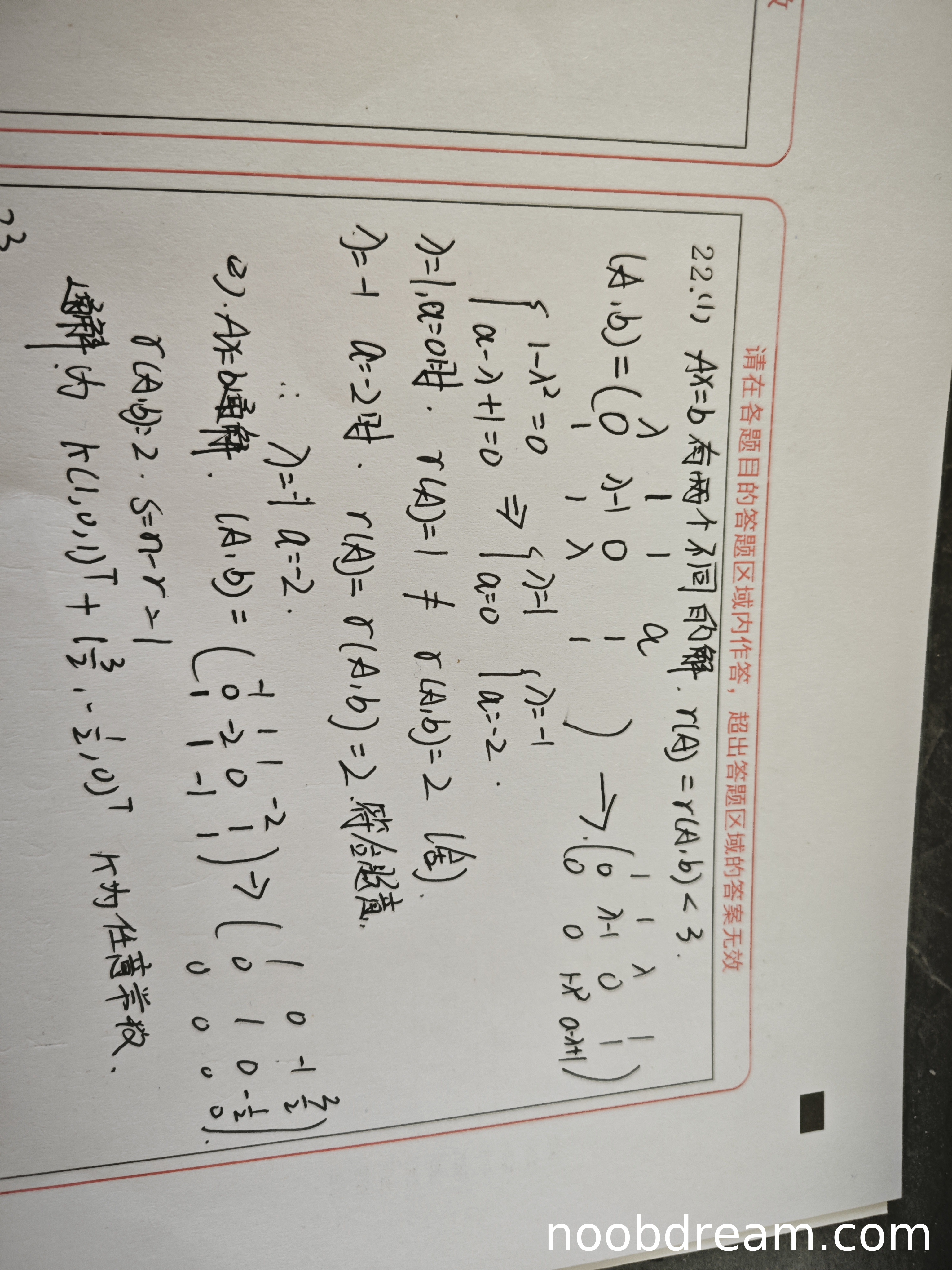 第1次识别:学生正确应用了“方程组有两个不同解则系数矩阵与增广矩阵秩相等且小于未知数个数”的条件,并通过初等行变换和行列式为零的方法得出λ=1或-1,然后正确排除了λ=1的情况,得到λ=-1和a=-2。思路正确,计算无误。但矩阵A的书写有误(第一行第一列应为λ,但学生写成了0),这可能是识别错误或抄写错误,根据规则不扣分。因此该部分可得满分5.5分。