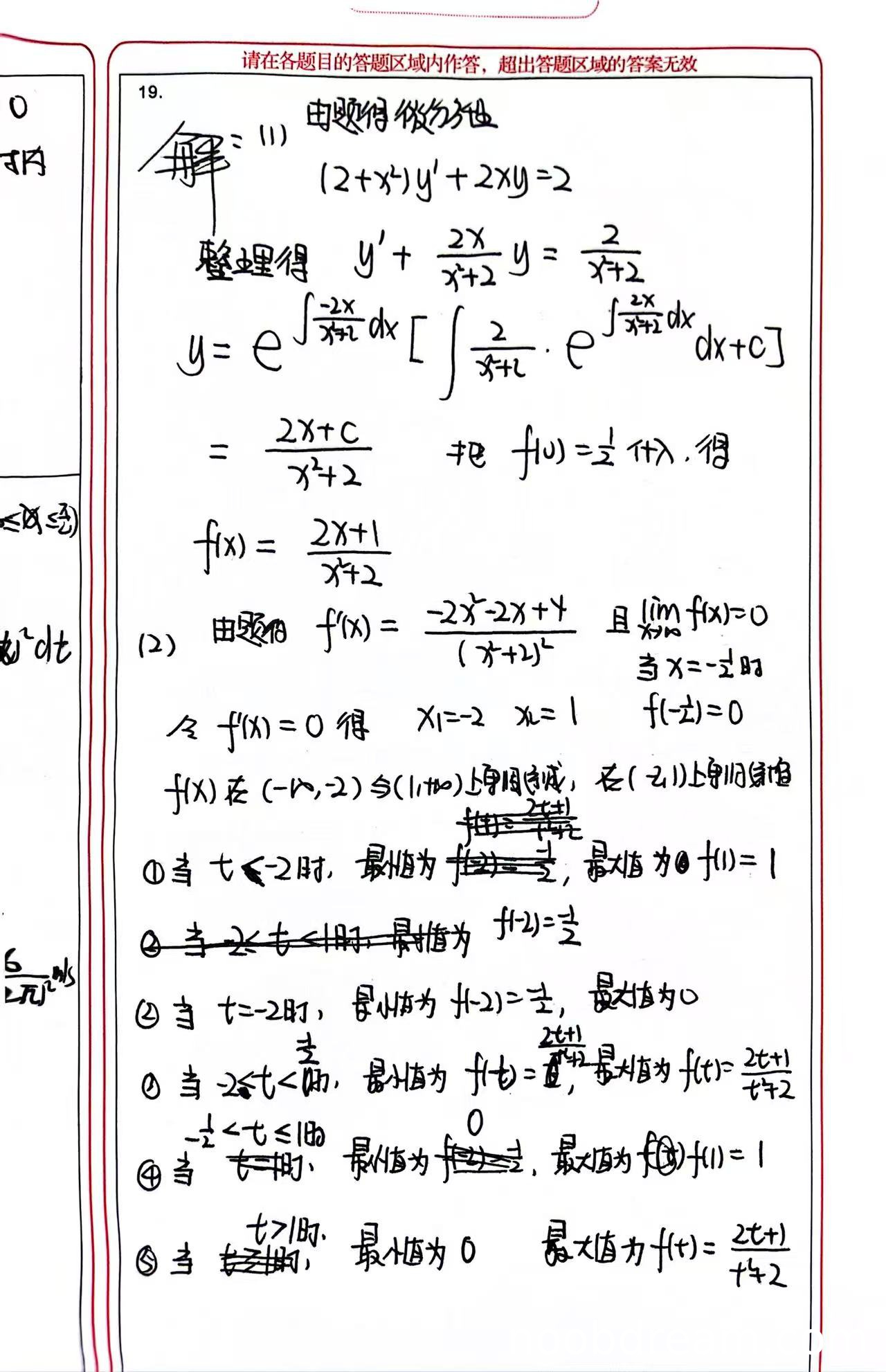 - ⑤ 当 \( t > 1 \) 时,学生给出最小值 \( 0 \),最大值 \( f(t) \),但实际最小值应为 \( 0 \)(极限值),最大值应为 \( f(t) \)(单调递减),此处正确,不扣分。