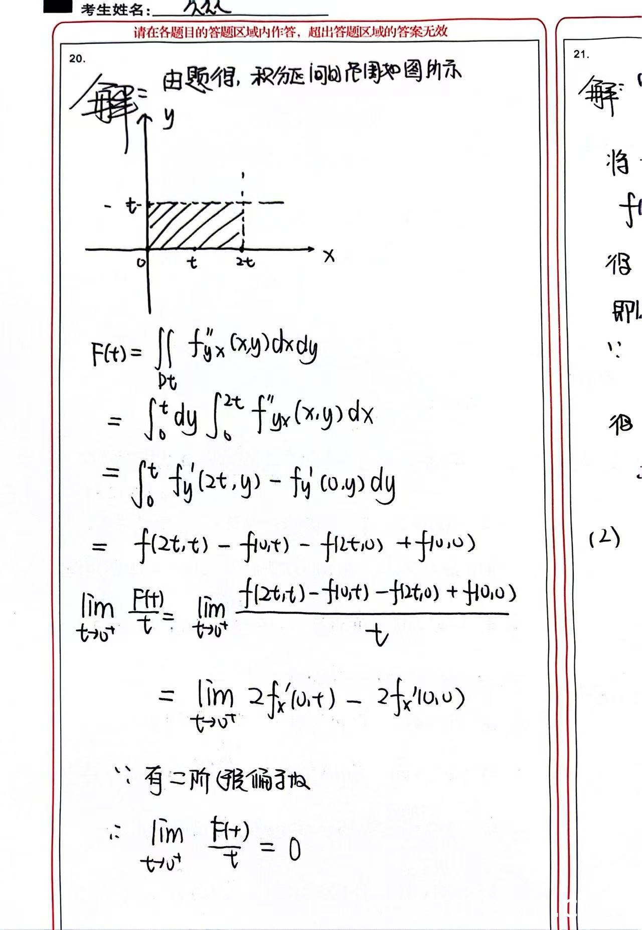 学生写出极限表达式:$\lim_{t\to0^+}\frac{f(2t,t)-f(0,t)-f(2t,0)+f(0,0)}{t}$(1分)