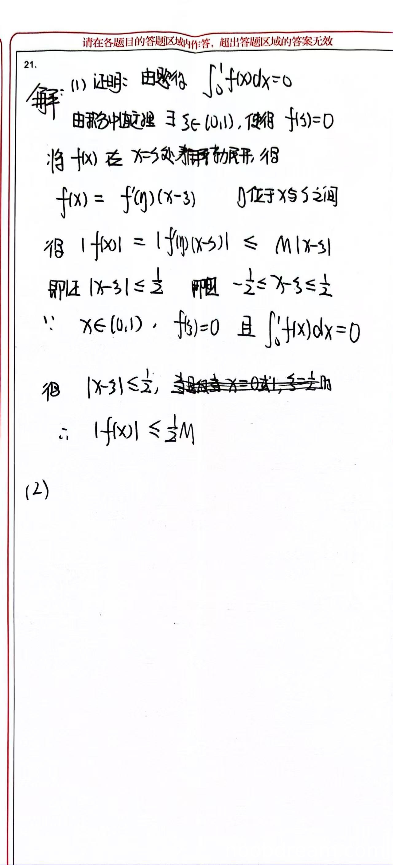 - 正确使用了积分中值定理得出存在ξ∈(0,1)使f(ξ)=0(+2分)