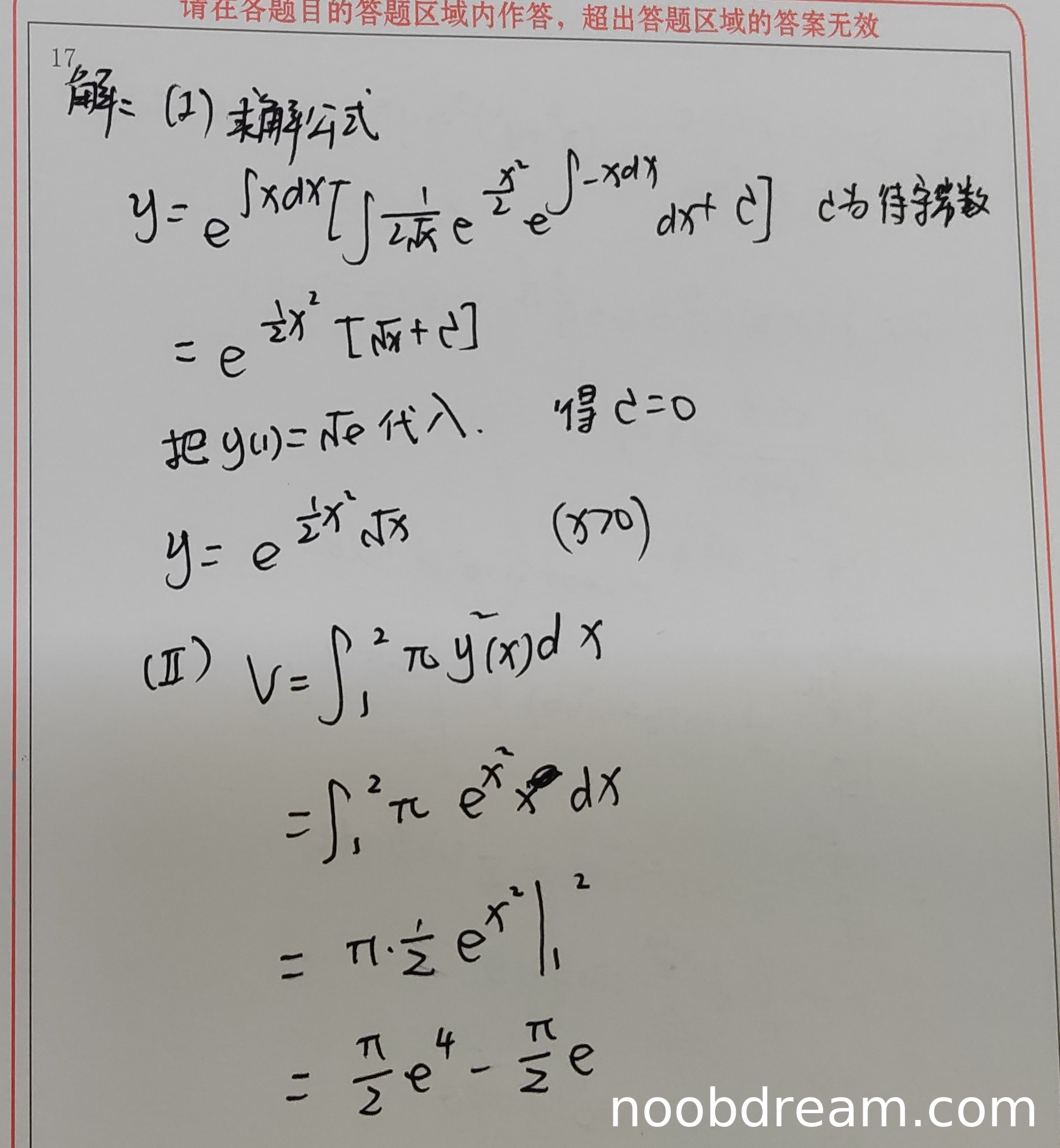 学生正确使用了一阶线性微分方程的求解公式,但在积分因子计算中存在逻辑错误。标准解法中积分因子应为 \( e^{\int -x dx} = e^{-\frac{x^2}{2}} \),但学生写成了 \( e^{\int x dx} = e^{\frac{x^2}{2}} \)。虽然最终得到了正确结果 \( y = e^{\frac{1}{2}x^2} \sqrt{x} \),但这可能是计算过程中的巧合。考虑到最终结果正确且满足初始条件,但方法存在逻辑缺陷,扣1分。