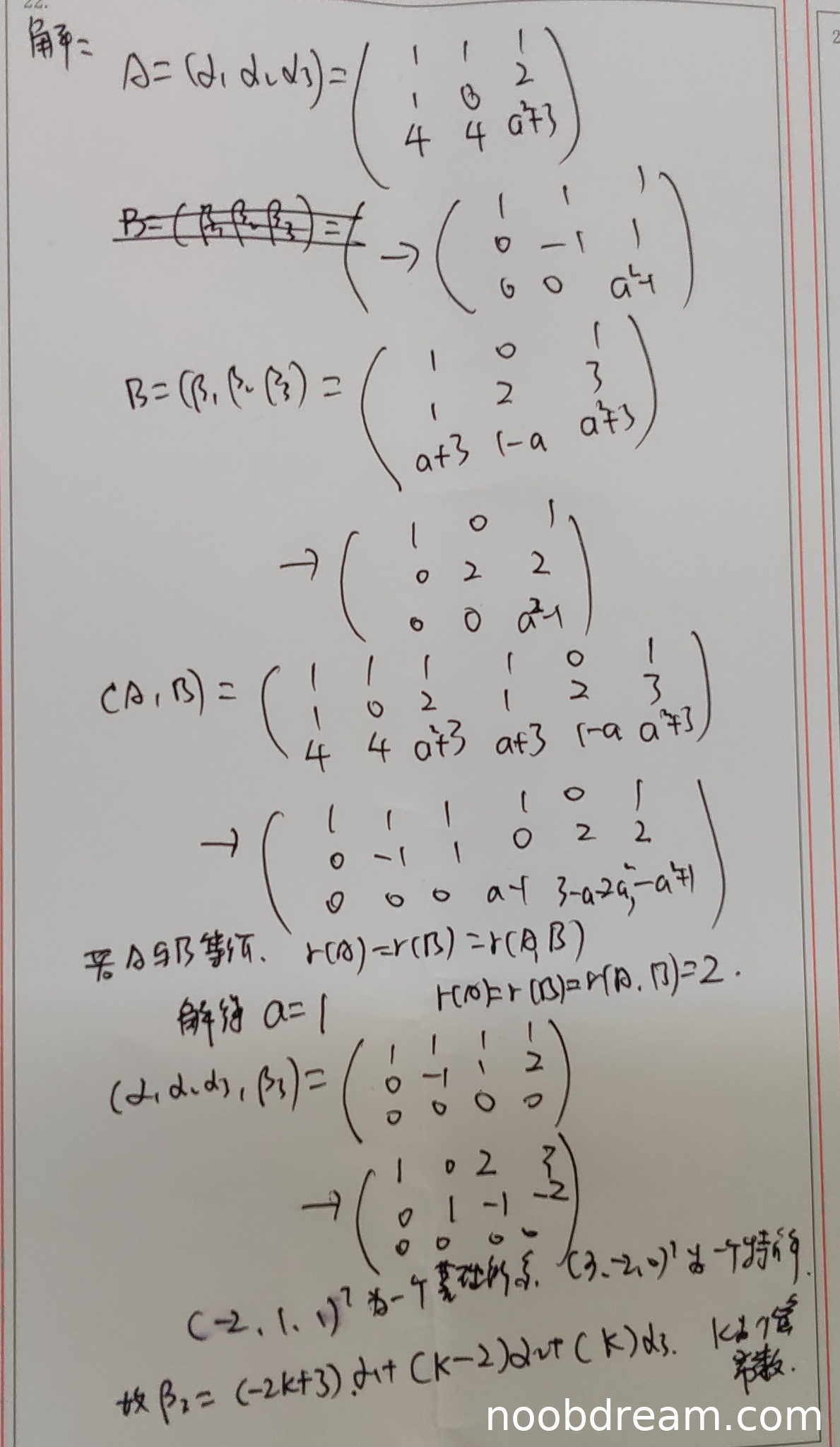 学生在 a=1 的情况下,正确将 β₃ 用 α₁, α₂, α₃ 线性表示,表达式为 β₃ = (-2k+3)α₁ + (k-2)α₂ + kα₃,其中 k 为任意常数,这与标准答案一致。虽然学生误将 β₃ 写作 β₂,但根据上下文判断为识别错误或笔误,不扣分。因此这一部分完全正确。