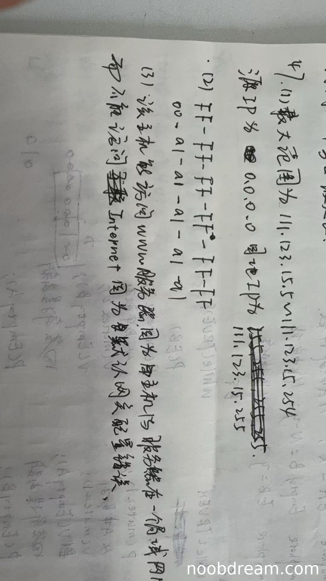 学生答案中,DHCP地址范围正确(111.123.15.5~111.123.15.254),得1分;DHCP Discover报文的源IP地址正确(0.0.0.0),得0.5分;但目的IP地址回答为111.123.15.255(应为255.255.255.255),存在逻辑错误,扣1分。因此本小题得1.5分。