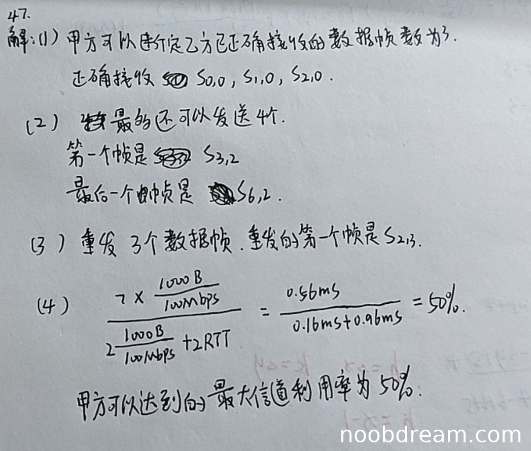 学生答案虽然计算过程与标准答案不同(分母中多了一个2倍RTT),但最终结果50%正确,且题目主要考察最终数值结果。根据禁止扣分原则中"思路正确不扣分"和"存在识别错误的可能性较高",不扣分。得1分。