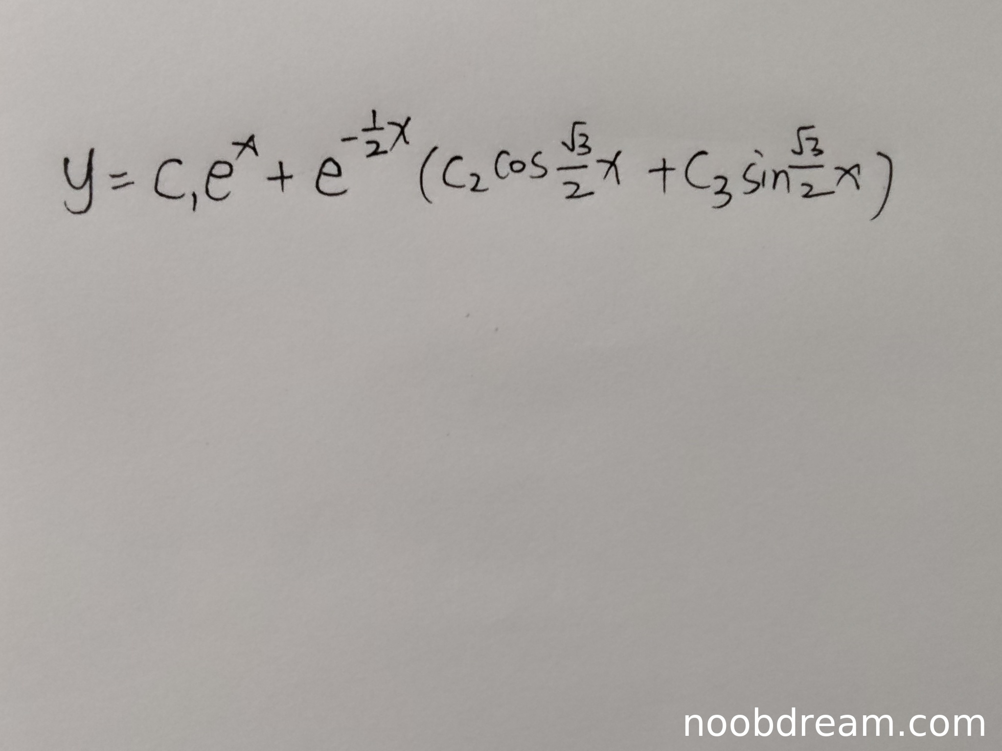 学生作答的两次识别结果本质相同,都是给出微分方程 \(y^{\prime \prime \prime} - y = 0\) 的通解形式。该微分方程的特征方程为 \(r^3 - 1 = 0\),解得特征根为 \(r_1 = 1\) 和 \(r_{2,3} = -\frac{1}{2} \pm \frac{\sqrt{3}}{2}i\)。因此,通解应为 \(y = C_1 e^x + e^{-\frac{1}{2}x} \left( C_2 \cos\frac{\sqrt{3}}{2}x + C_3 \sin\frac{\sqrt{3}}{2}x \right)\)。学生的答案与此完全一致,且使用了任意常数 \(C_1, C_2, C_3\),符合通解要求。因此,该作答正确,得5分。