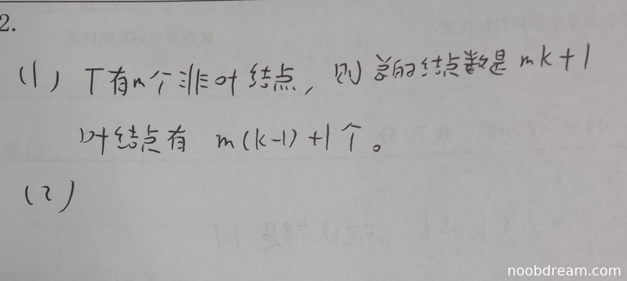 学生第一次识别结果给出了正确的叶结点数量公式 $m(k-1)+1$,推导过程虽然简洁但结论正确。第二次识别结果中虽然将非叶结点符号误写为"n"(应为"m"),但公式结构相同,属于符号误写不影响核心逻辑。因此本题得满分3分。
