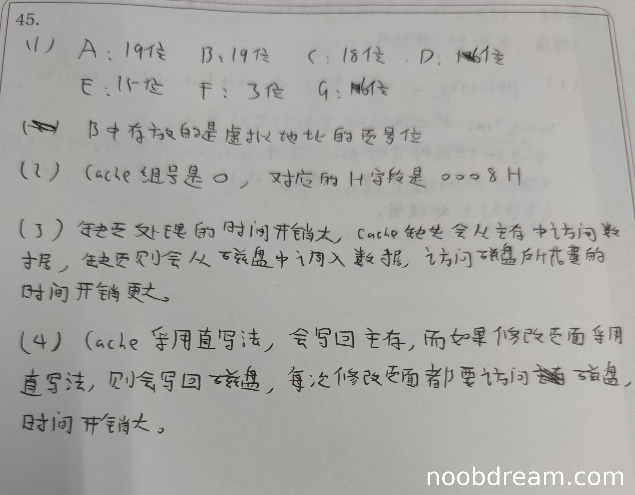 学生正确解释了Cache采用直写策略和页面修改采用回写策略的原因,指出了访问磁盘时间开销大的关键点,回答正确,得2分。