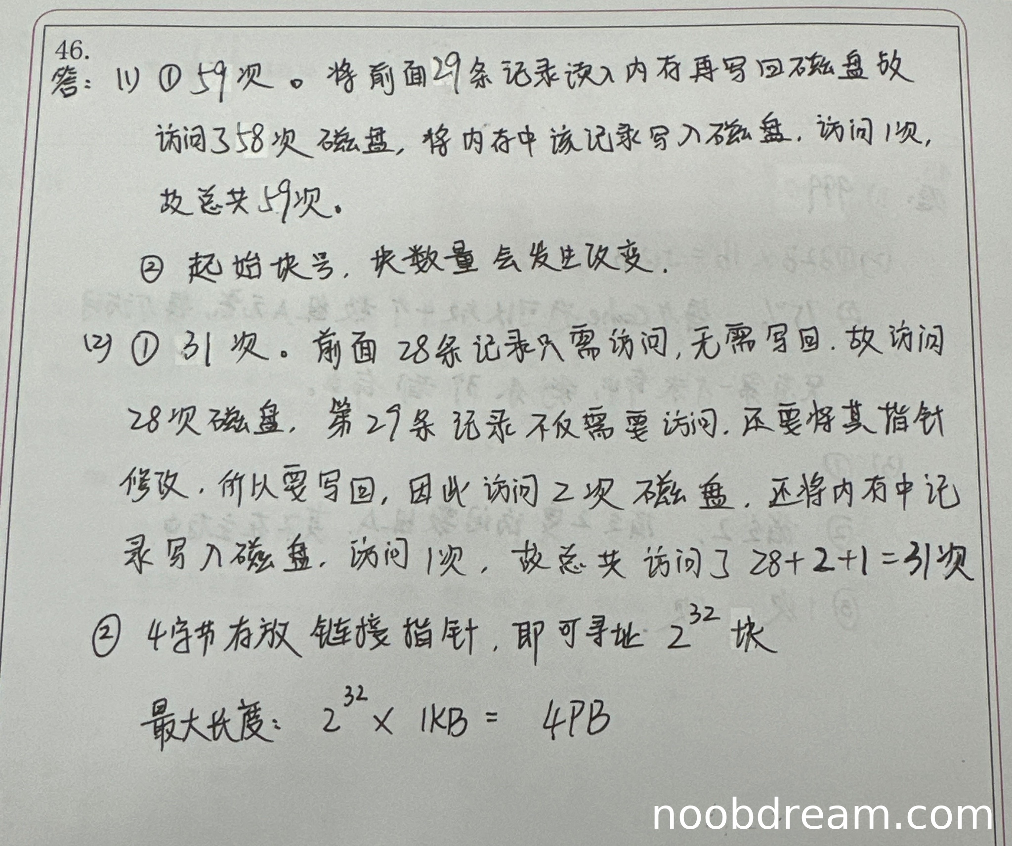 第二问:学生计算最大长度为4PB,但标准答案为4080GB。学生忽略了每个磁盘块中4B用于存放链接指针,实际数据部分只有1020B,应该计算为2³²×1020B=4080GB。学生直接使用2³²×1KB=4PB的计算方法是错误的,需要扣分。根据评分说明,若按4096GB计算可得1分,但学生计算为4PB,明显错误,得0分。