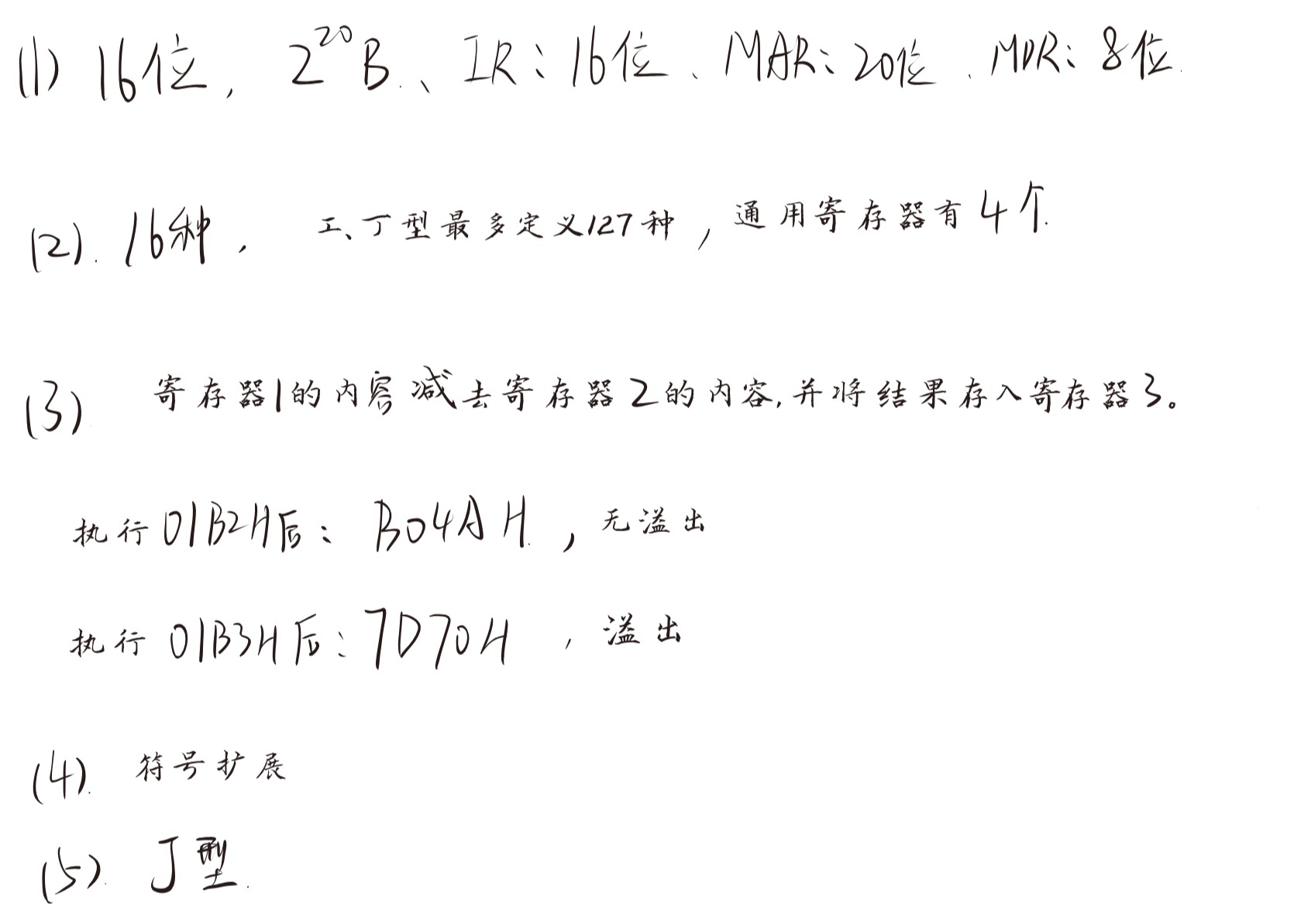 学生答案:R型最多16种操作、通用寄存器4个正确;但I型和J型总共最多127种操作错误(标准答案为63种)。扣1分。得2分。
