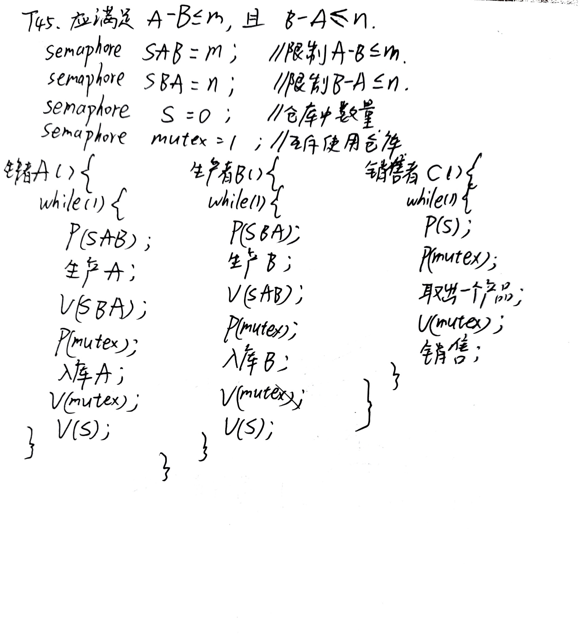 - 生产者A和B的流程正确:先通过P(SAB)/P(SBA)实现生产数量限制,生产后通过V(SBA)/V(SAB)更新计数器,再通过mutex互斥入库,最后V(S)增加库存。