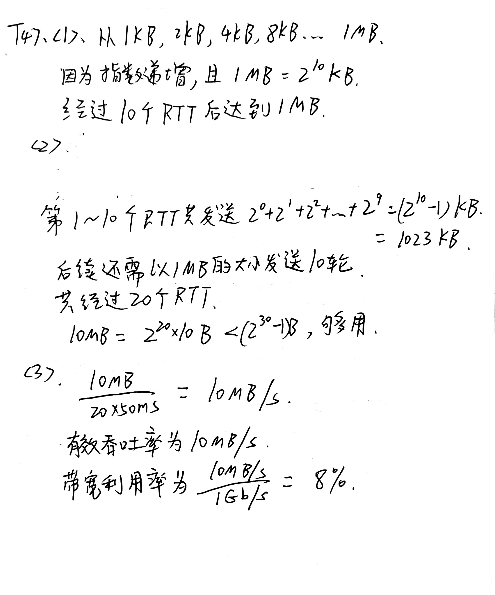 学生正确计算出发送窗口达到1MB需要10个RTT,思路与标准答案一致,得3分。