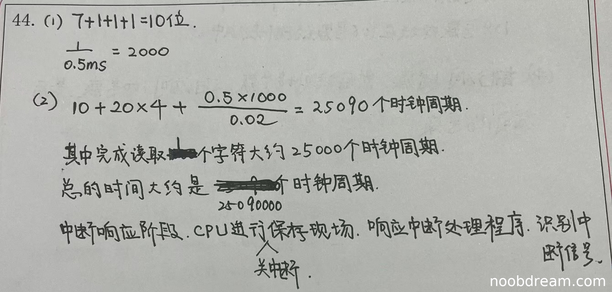 考虑到学生正确描述了中断响应阶段的主要操作,且部分计算思路正确,给予部分分数。得2分。