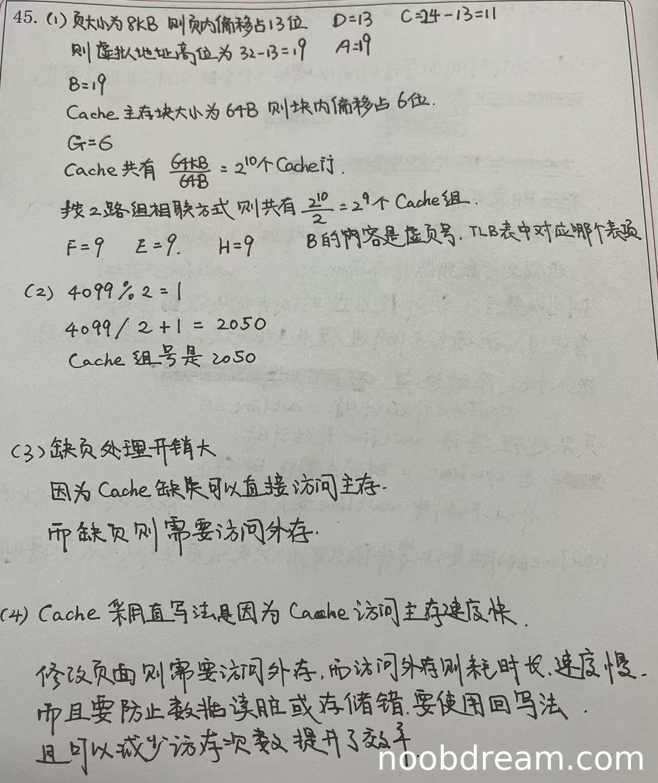 学生计算Cache组号的方法错误:4099%2=1和4099/2+1=2050是错误的逻辑。正确计算应为:主存块号4099的二进制低9位为组号,即4099 mod 512 = 3,因此组号应为3。学生答案错误,得0分。H字段内容未正确回答,得0分。本小题得0分。