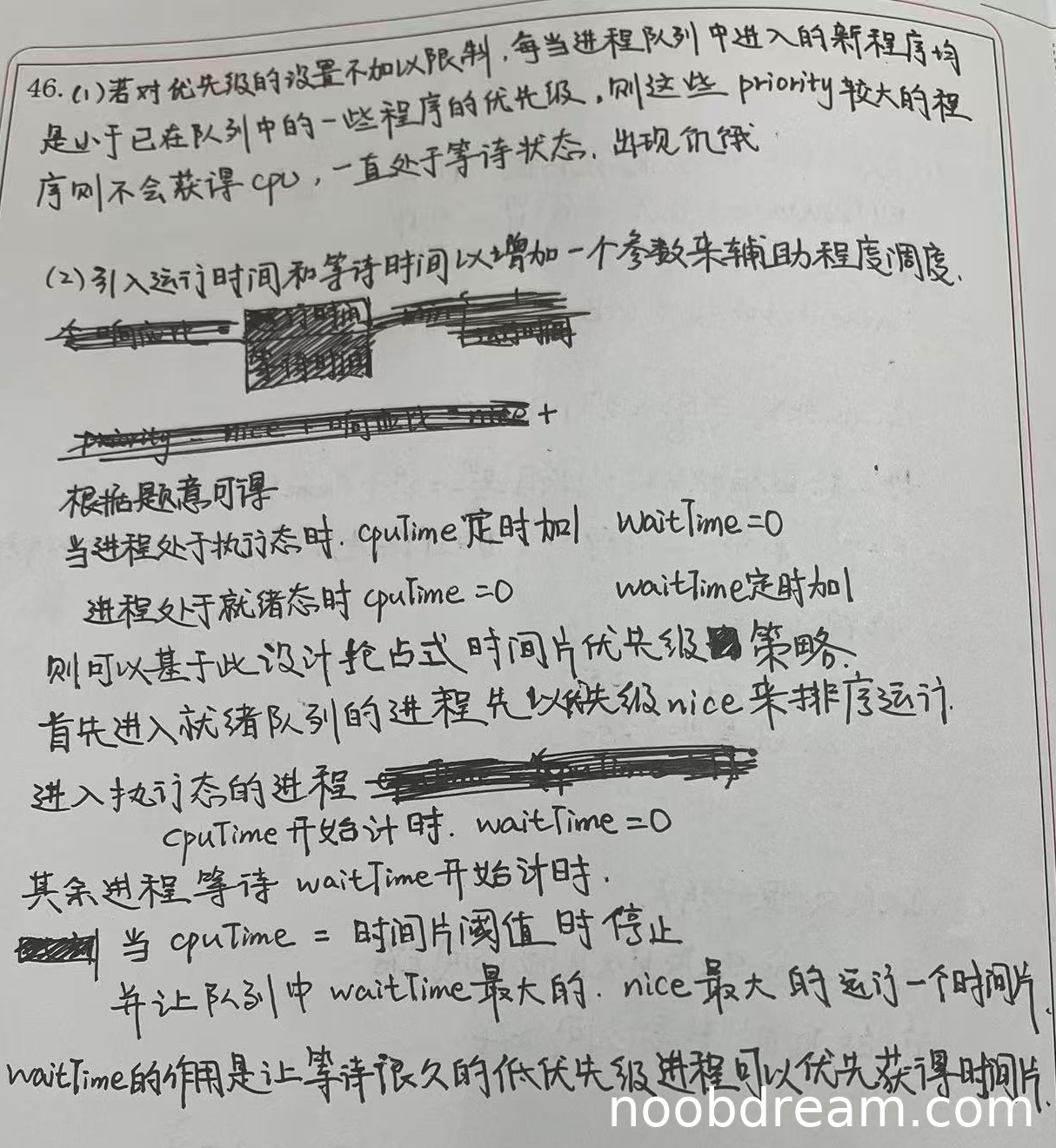 学生提出了使用抢占式时间片优先级策略,并提到根据waitTime和nice来选择下一个运行的进程,但未给出具体的动态优先数计算公式。虽然思路中隐含了通过waitTime来提升等待进程的优先级,但未明确表达为优先数的数学计算(如标准答案中的priority = nice + k1×cpuTime - k2×waitTime)。此外,学生提到“让队列中waitTime最大的、nice最大的运行一个时间片”,这里逻辑有误:如果目标是避免饥饿,应优先选择waitTime大的进程,但nice最大的(即静态优先级最低的)不一定是需要优先调度的;实际上,应通过动态优先数计算来综合调整。由于未给出明确的公式且部分逻辑不清晰,扣2分。对waitTime作用的描述基本正确(让等待久的进程优先运行),得1分。本小题总得分:1分。