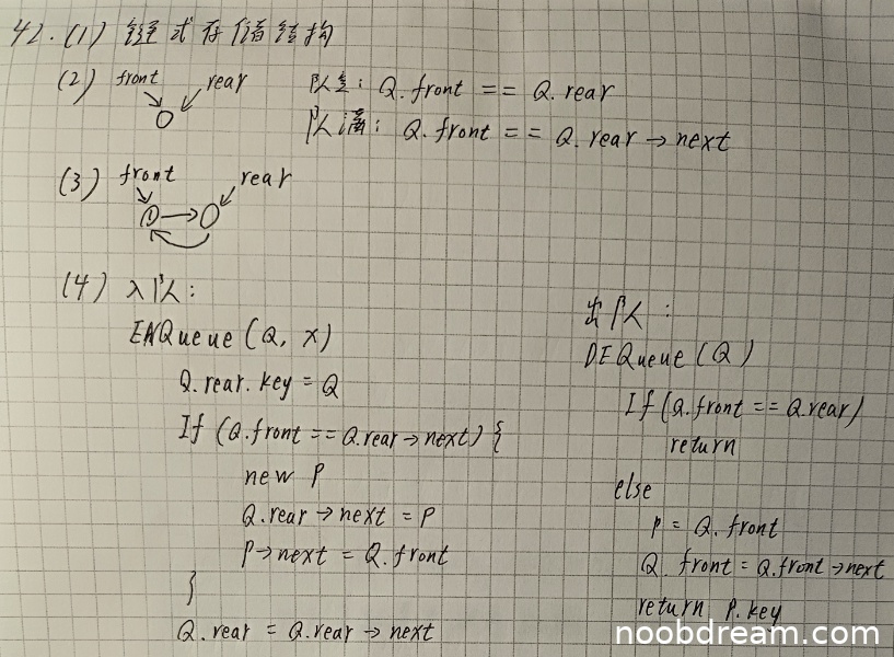 学生给出的入队和出队操作伪代码与标准答案基本一致,但入队操作中“Q.rear.key = Q”应为“Q.rear.key = x”,可能是识别错误,根据规则不扣分。得2分。