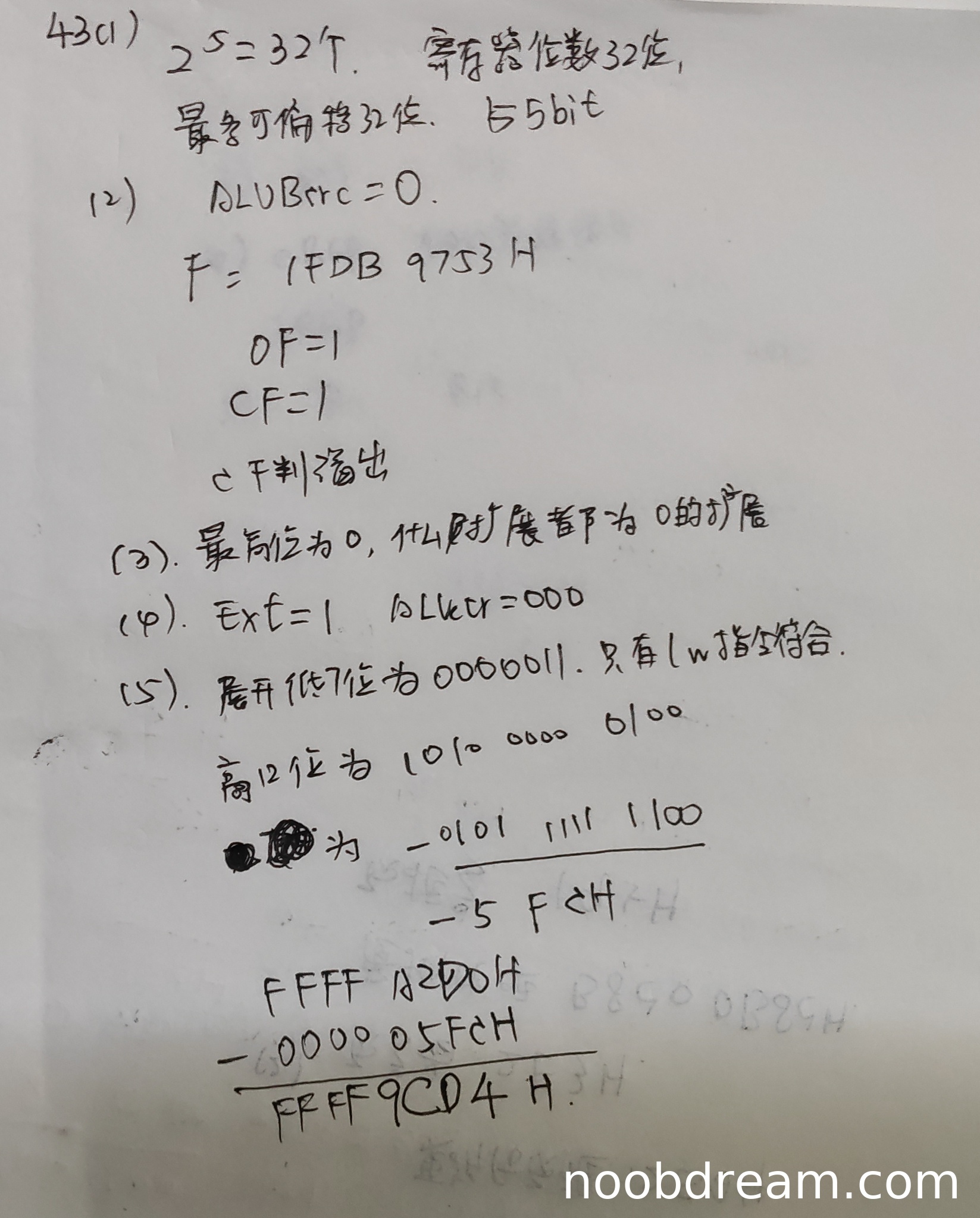 学生回答ALUBsrc=0,正确;F=1FDB9753H,正确;OF=1,正确;CF=1,正确;但学生说"已判断溢出"未明确说明根据CF判断无符号溢出,而标准答案要求明确说明根据CF判断无符号溢出。此处逻辑不完整,扣1分。得2分。