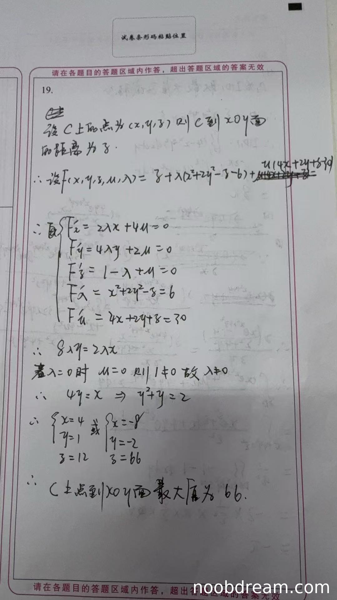 学生使用拉格朗日乘数法求解距离最大值,思路正确。但在构造拉格朗日函数时存在两处错误: