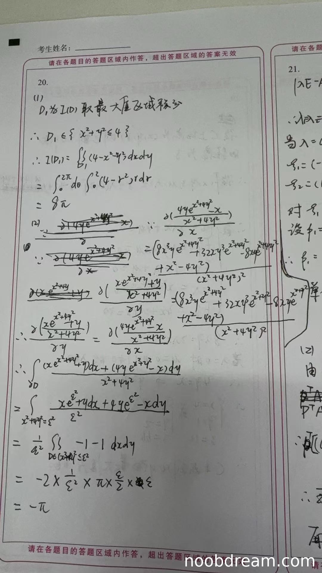 - 学生直接令 \(x^2 + 4y^2 = \varepsilon^2\) 并计算曲线积分,但未说明该曲线与 \(D_1\) 边界的关系,且计算过程中面积计算有误(椭圆面积应为 \(\pi \cdot \varepsilon \cdot \frac{\varepsilon}{2} = \frac{\pi \varepsilon^2}{2}\),但学生写为 \(\pi \times \frac{\varepsilon}{2} \times \varepsilon\),结果正确但表述不严谨)。