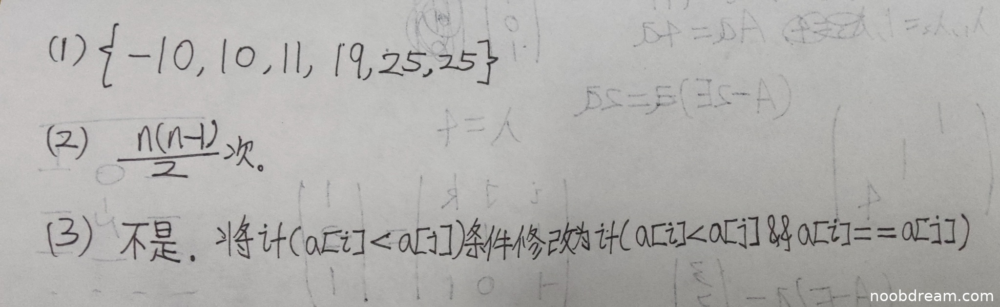 学生答案正确,比较次数为n(n-1)/2,与标准答案一致。得2分。