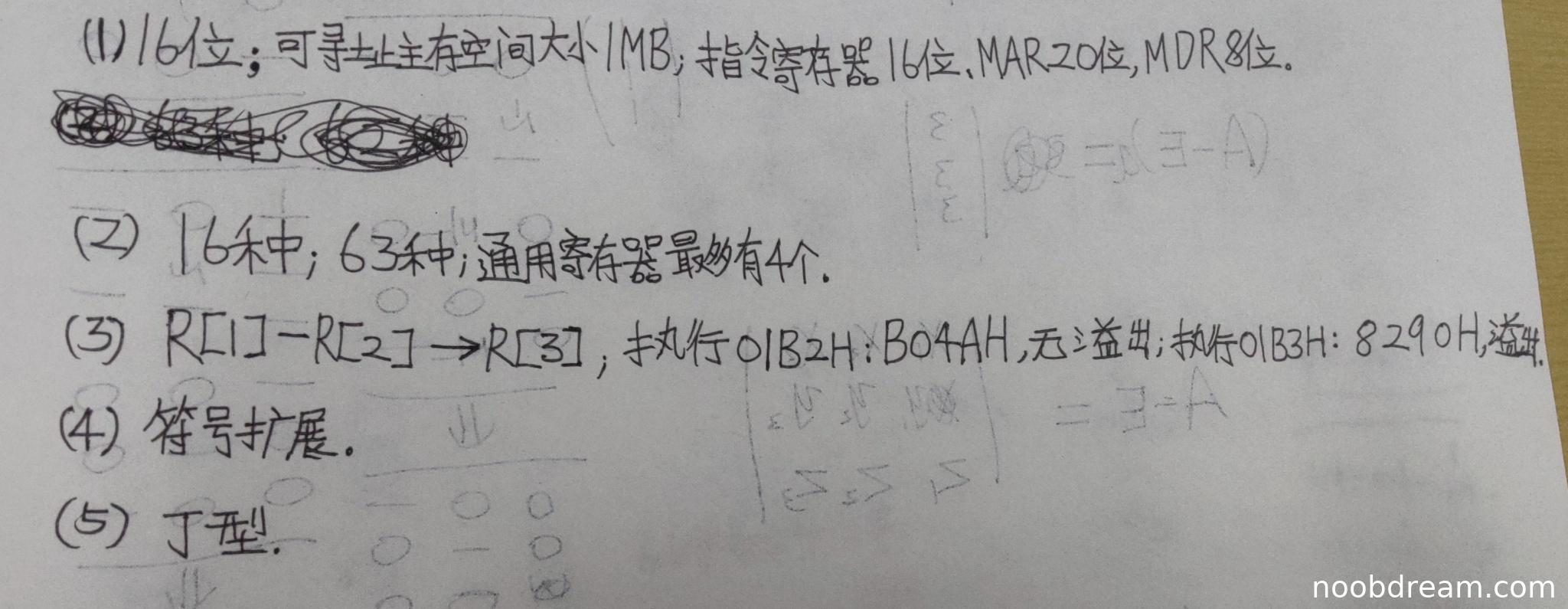 学生答案:ALU宽度16位、主存空间1MB、指令寄存器16位、MAR20位、MDR8位,与标准答案完全一致。得3分。