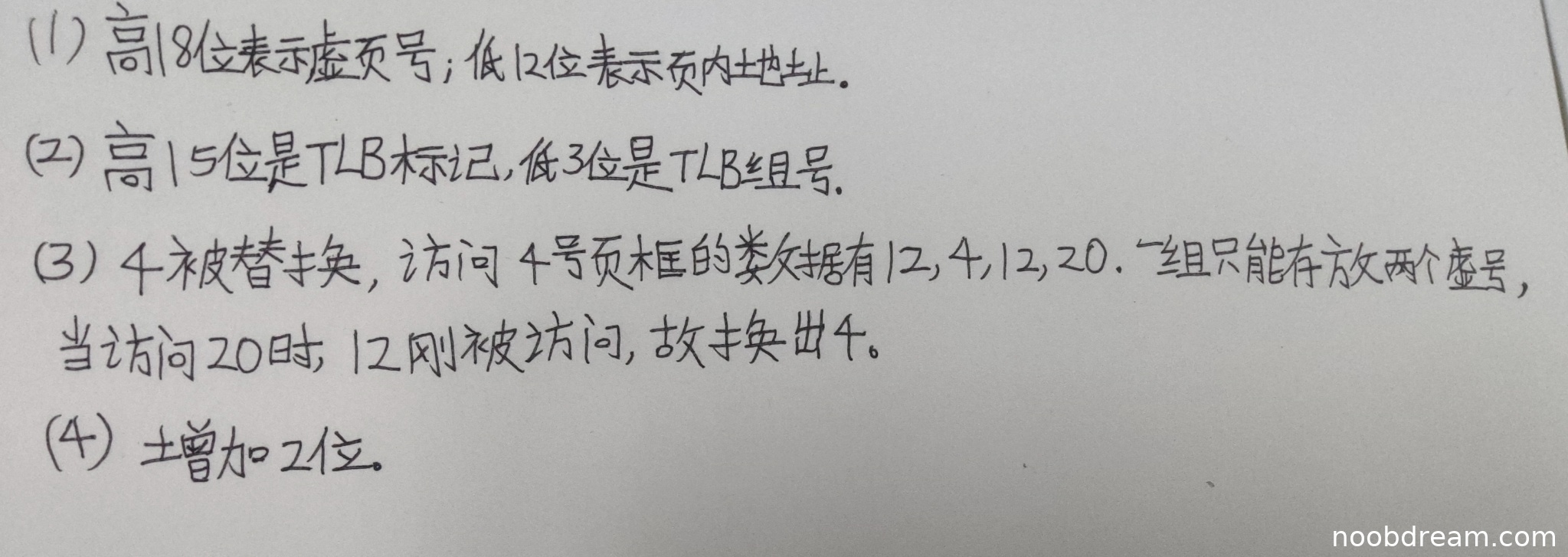 学生答案正确指出TLB标记为高15位,TLB组号为低3位,与标准答案一致。得2分。