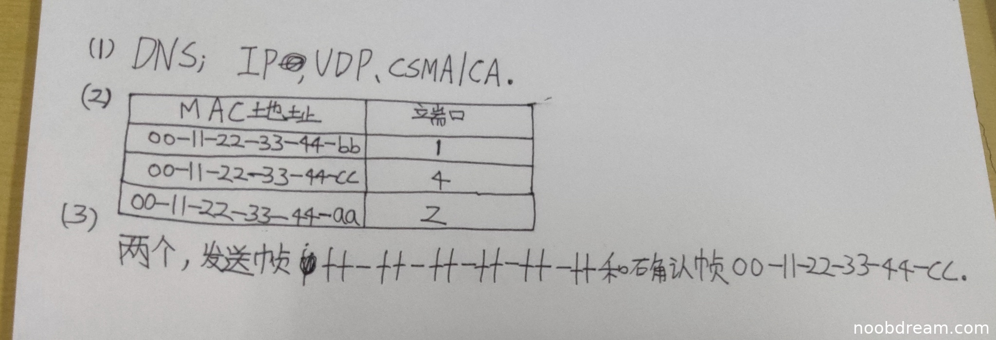 学生正确指出了应用层协议为DNS,得1分。在逐层封装部分,第一次识别结果中"VDP"明显是"UDP"的误写(根据第二次识别结果确认),根据禁止扣分规则第1条,不扣分;但学生将数据链路层协议写为"CSMA/CA"是错误的,正确应为"CSMA/CD"或以太网帧,扣1分。因此本小题得2分。